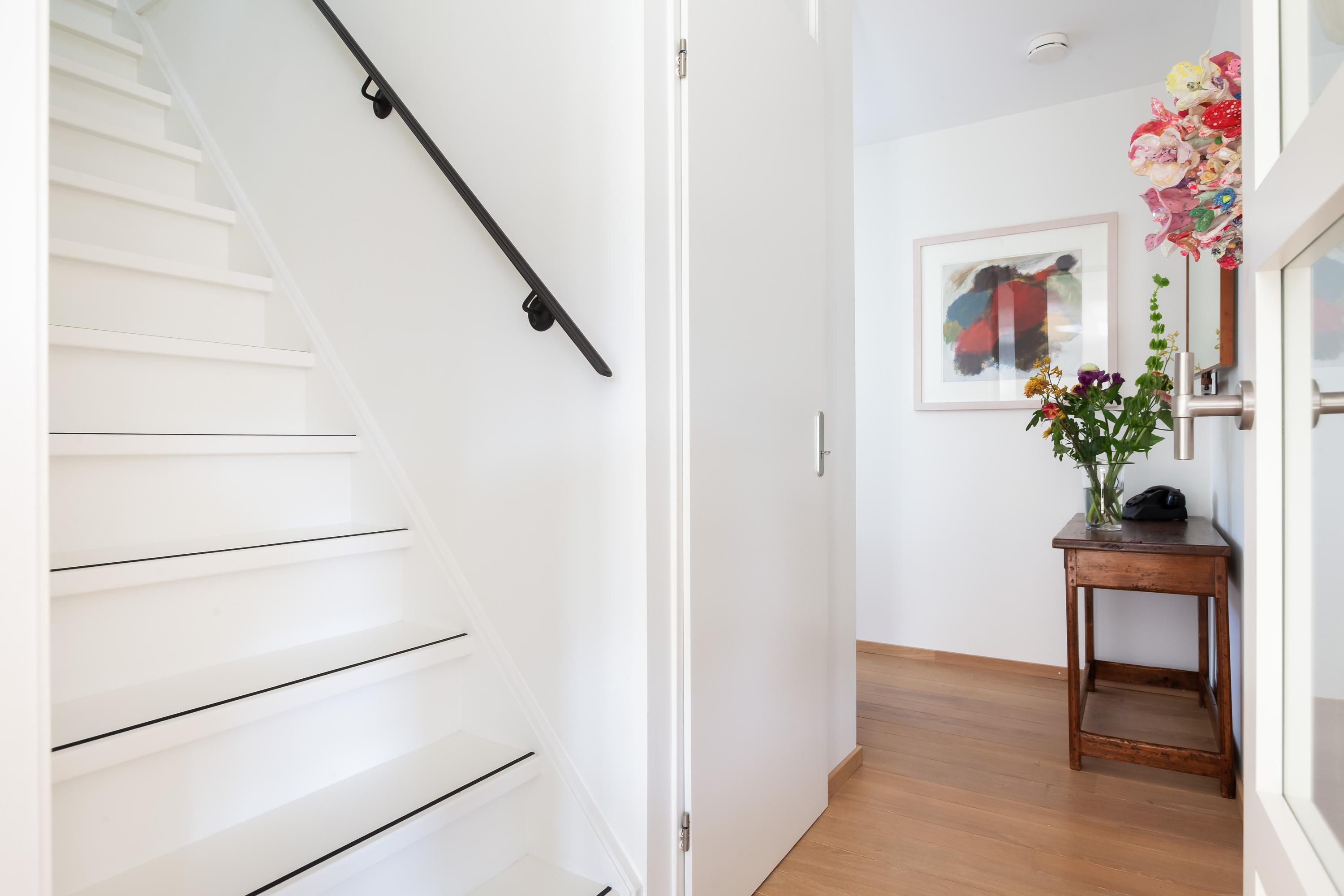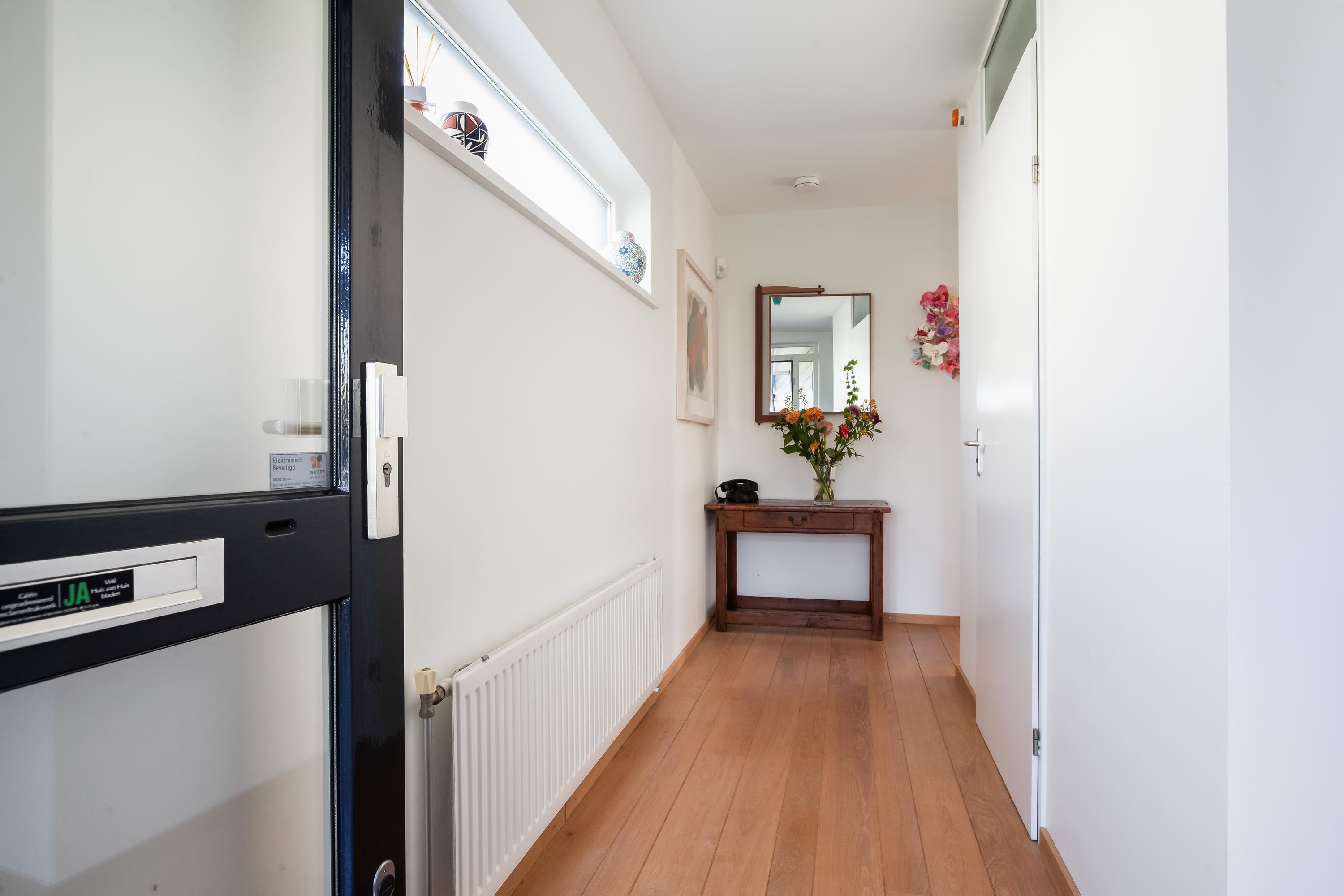 Via de oprit bereik je de berging met openslaande deuren en aan de zijkant bevindt zich de overdekte entree. De hal heeft een trap naar boven en geeft je toegang tot de nette toiletruimte, de meterkast, een praktische trapkast, de garage en de woonruimte.