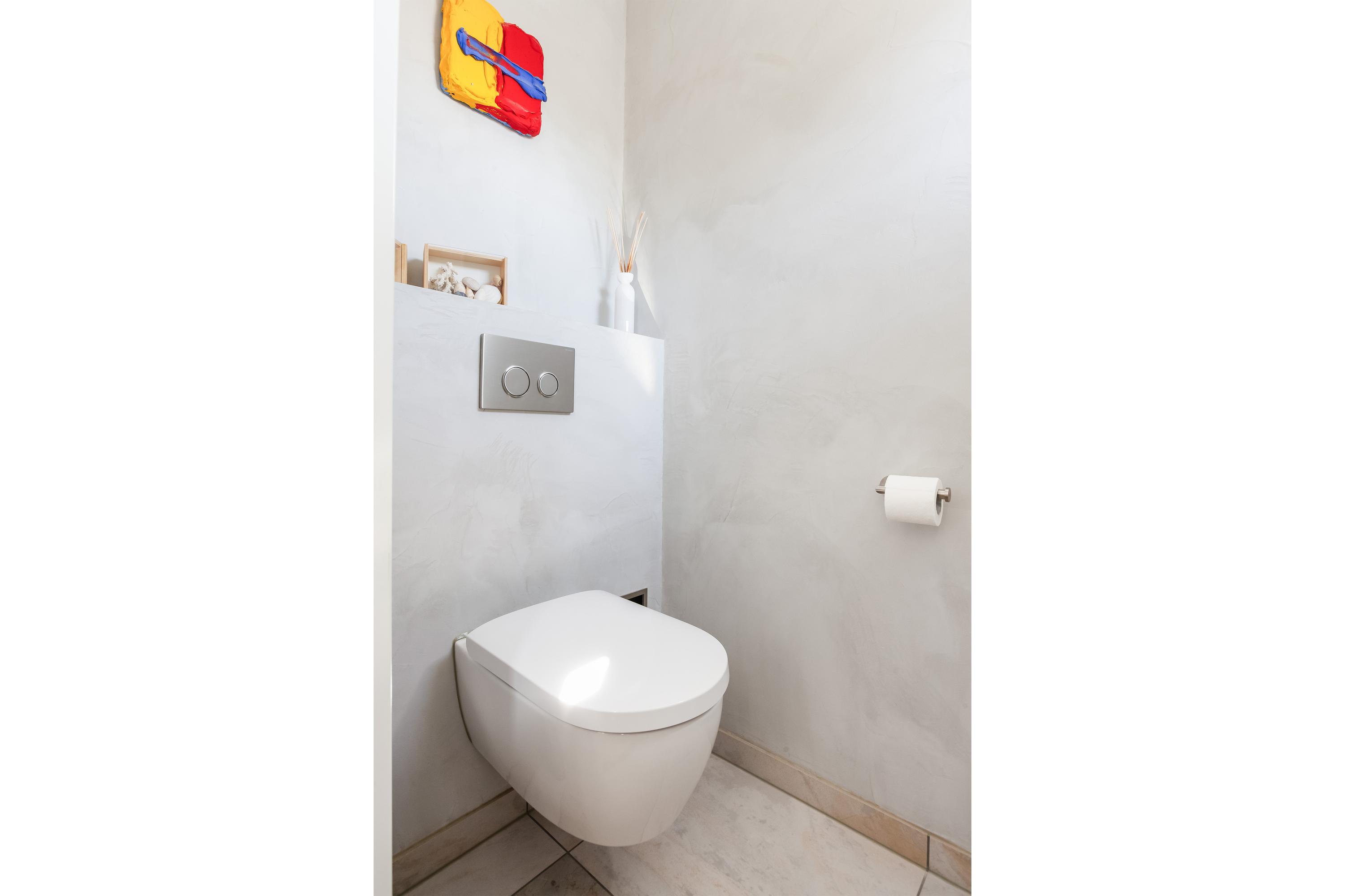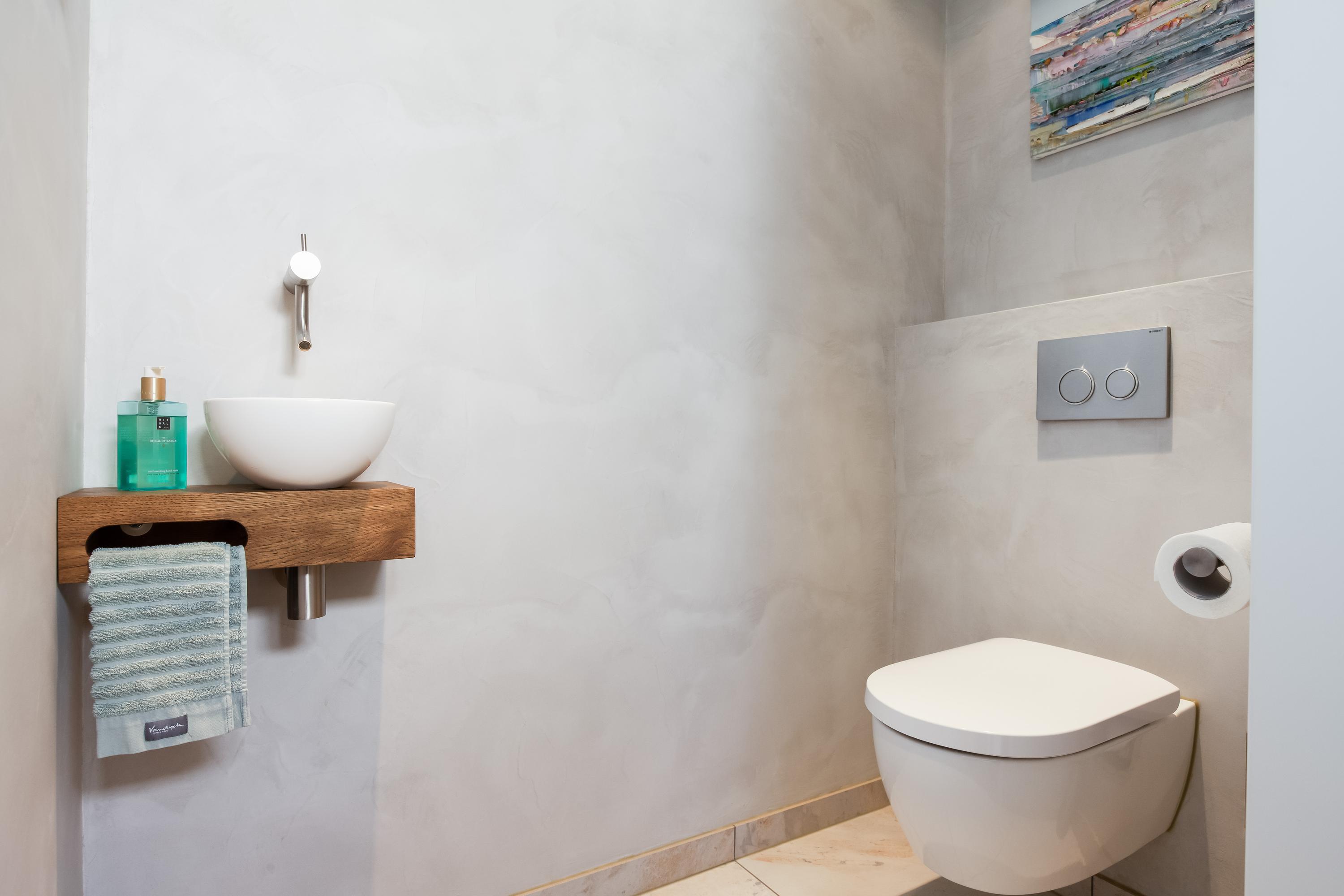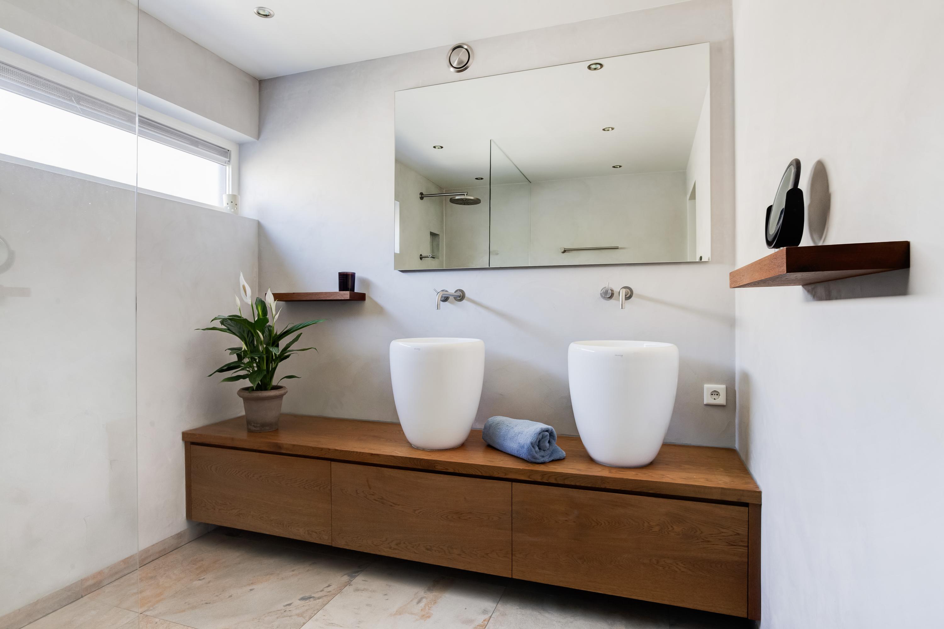 De tussengelegen badkamer is strak afgewerkt en uitgerust met een:
