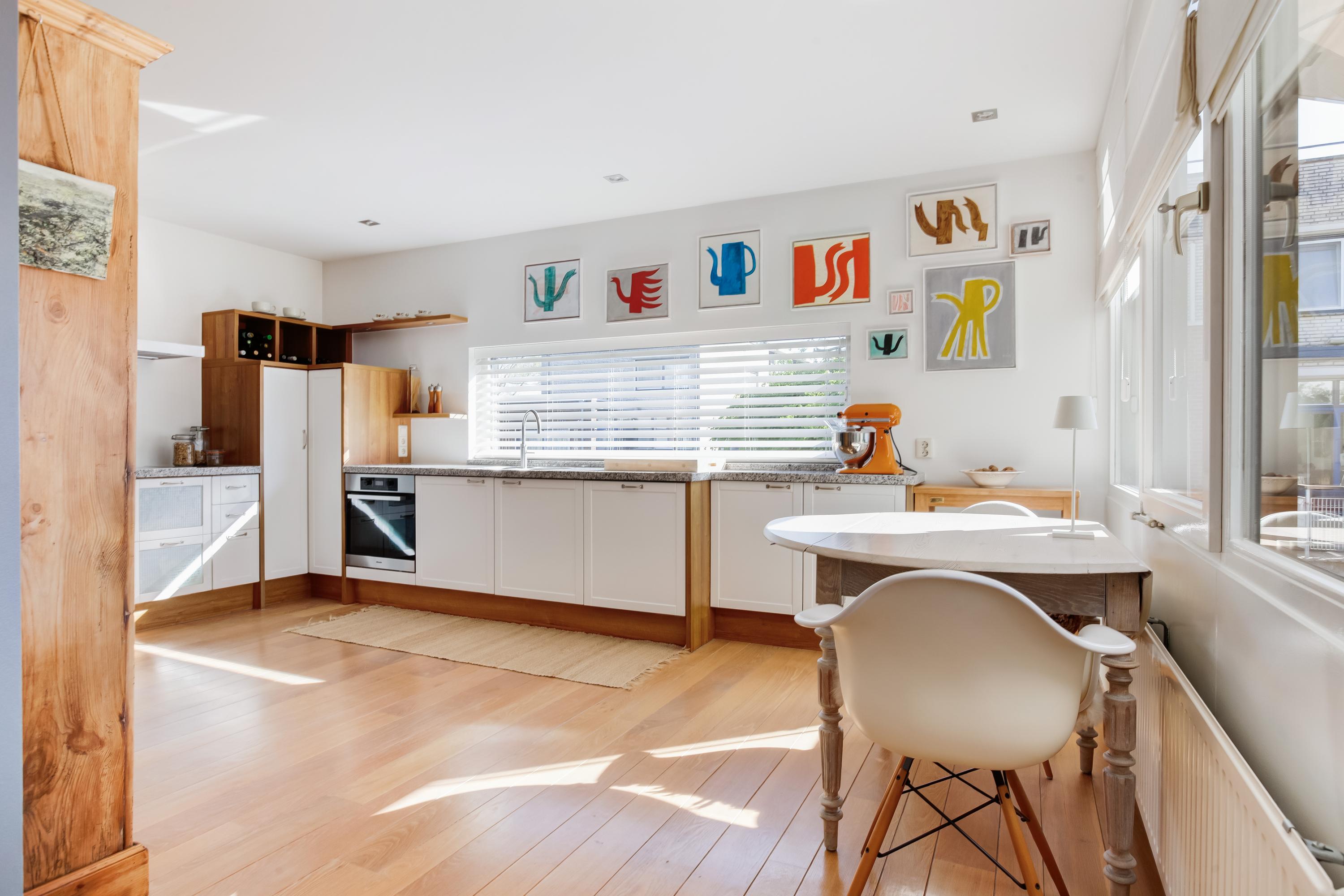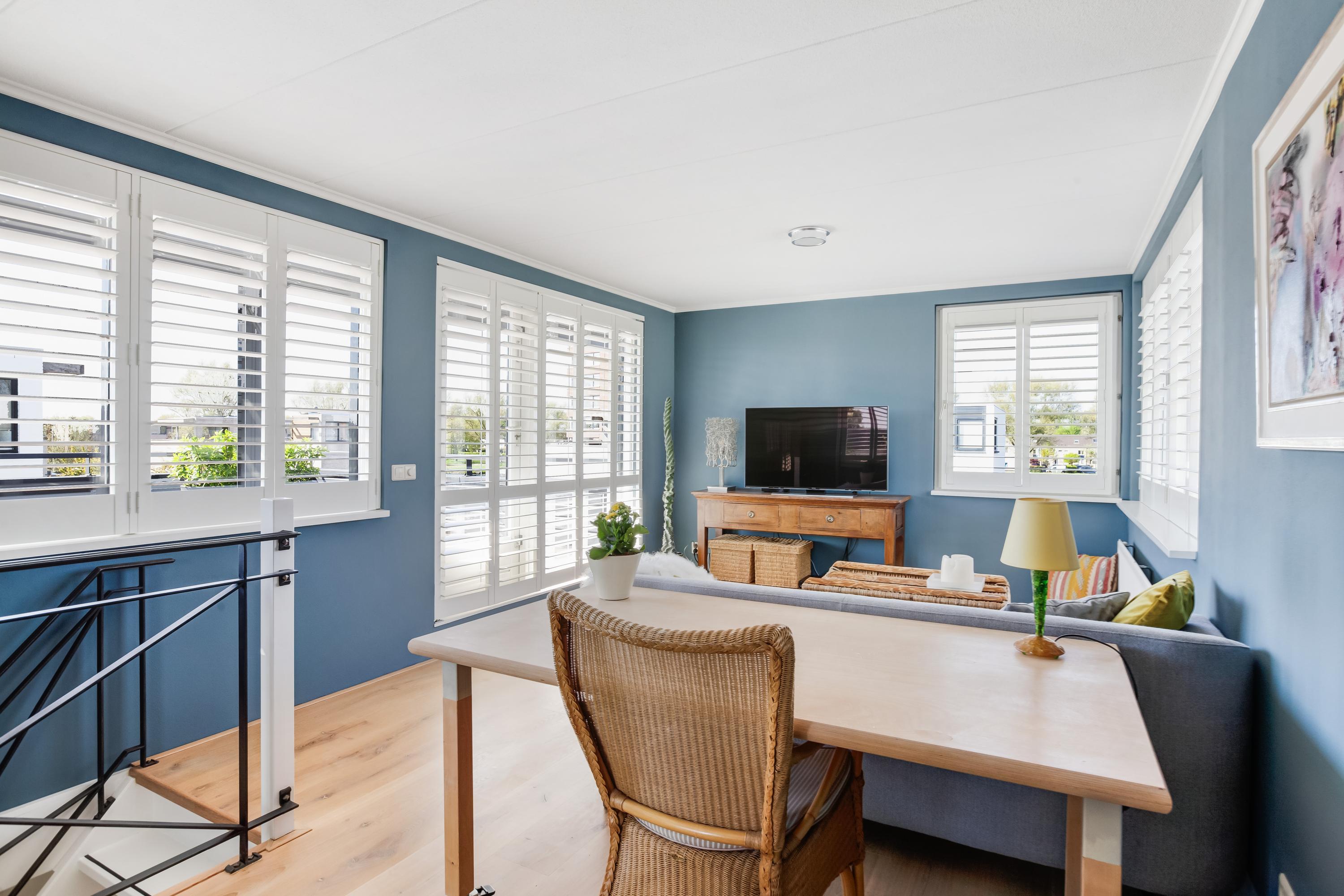 De ruime woonkamer is aan de voorzijde gelegen, is licht en beschikt over een brede schuifpui naar het terras. Het eetgedeelte en de keuken zijn aan de achterzijde gesitueerd en hebben een fijn uitzicht op het water. De complete keuken is in een hoek opgesteld en de volgende apparatuur is aanwezig: