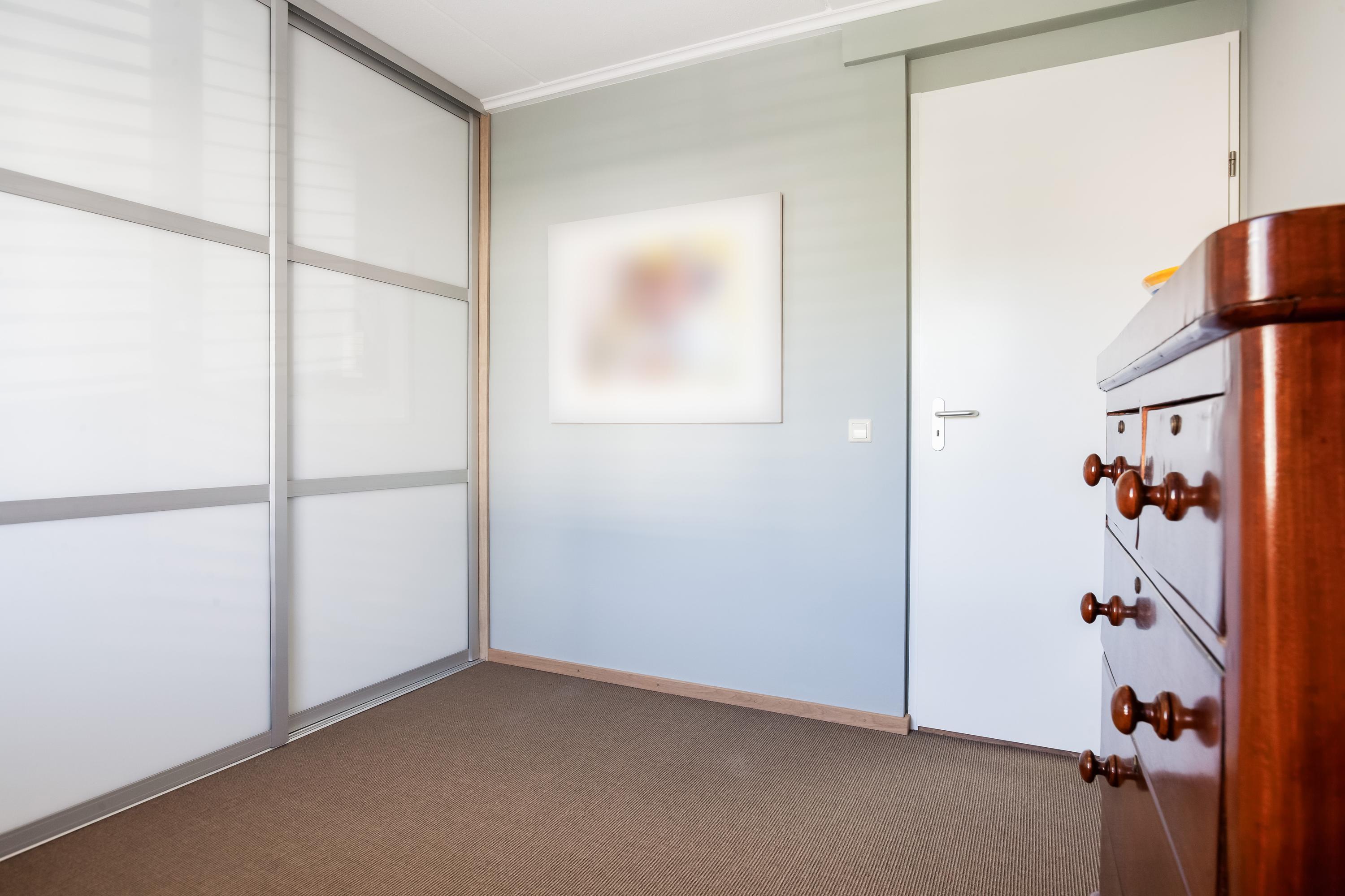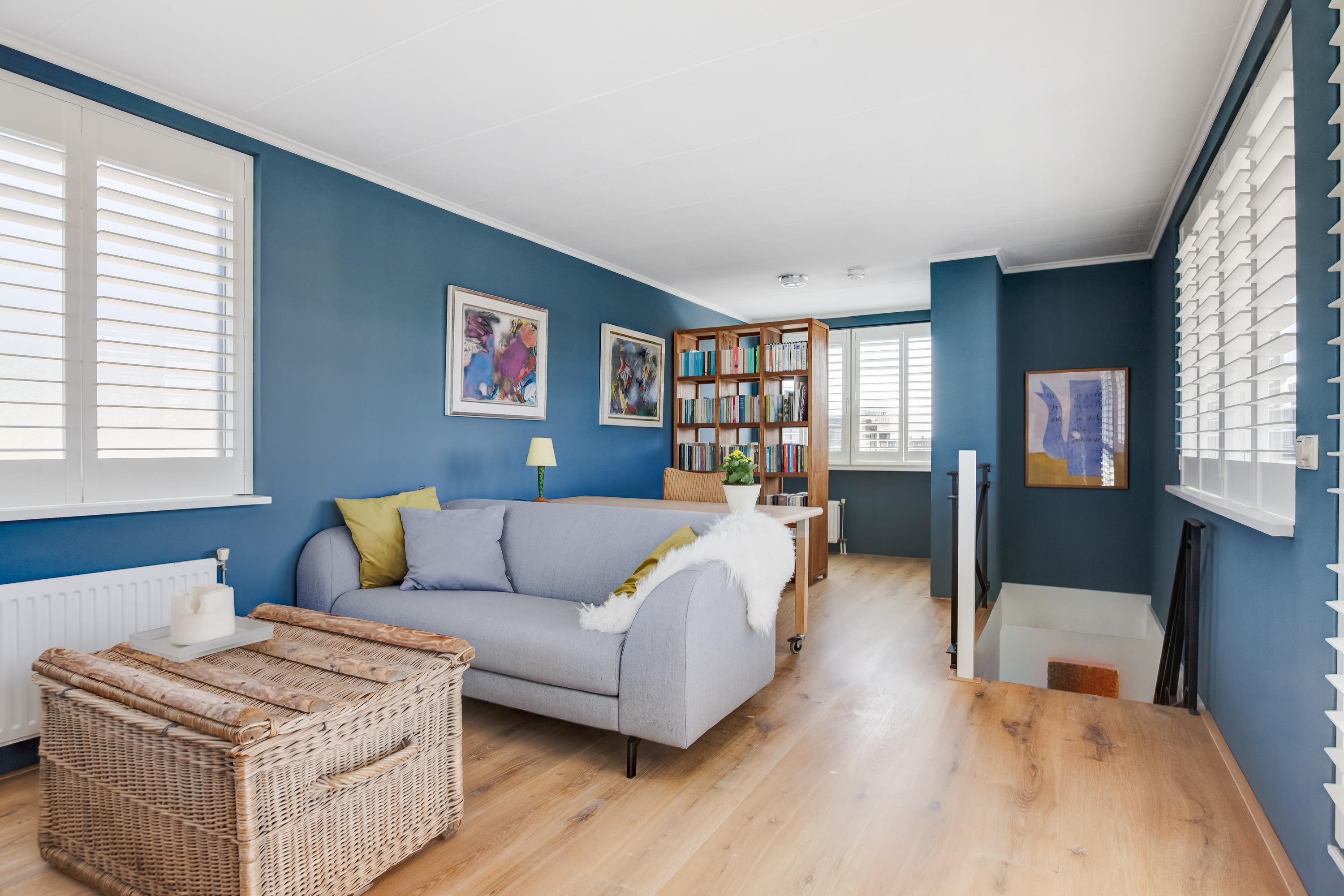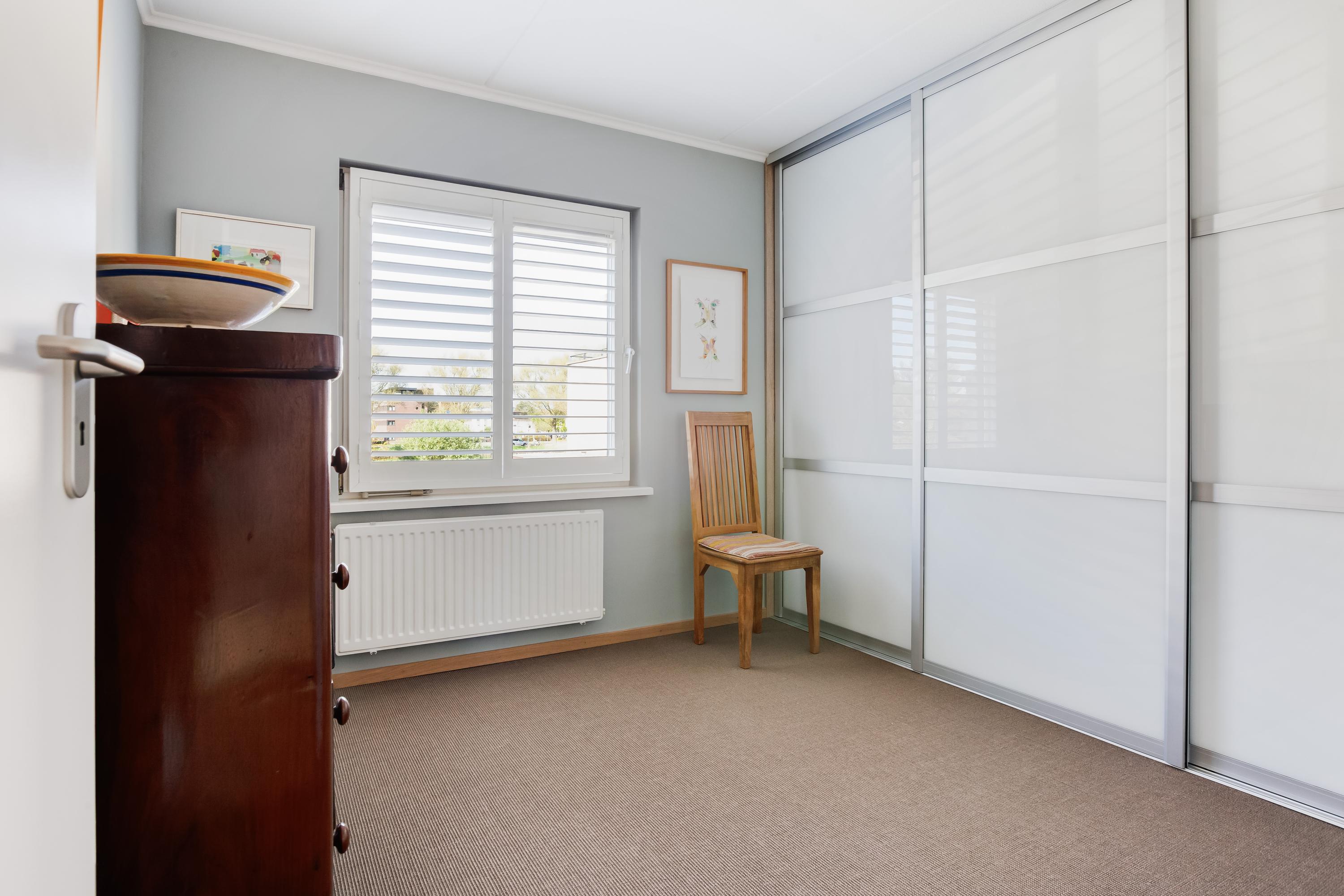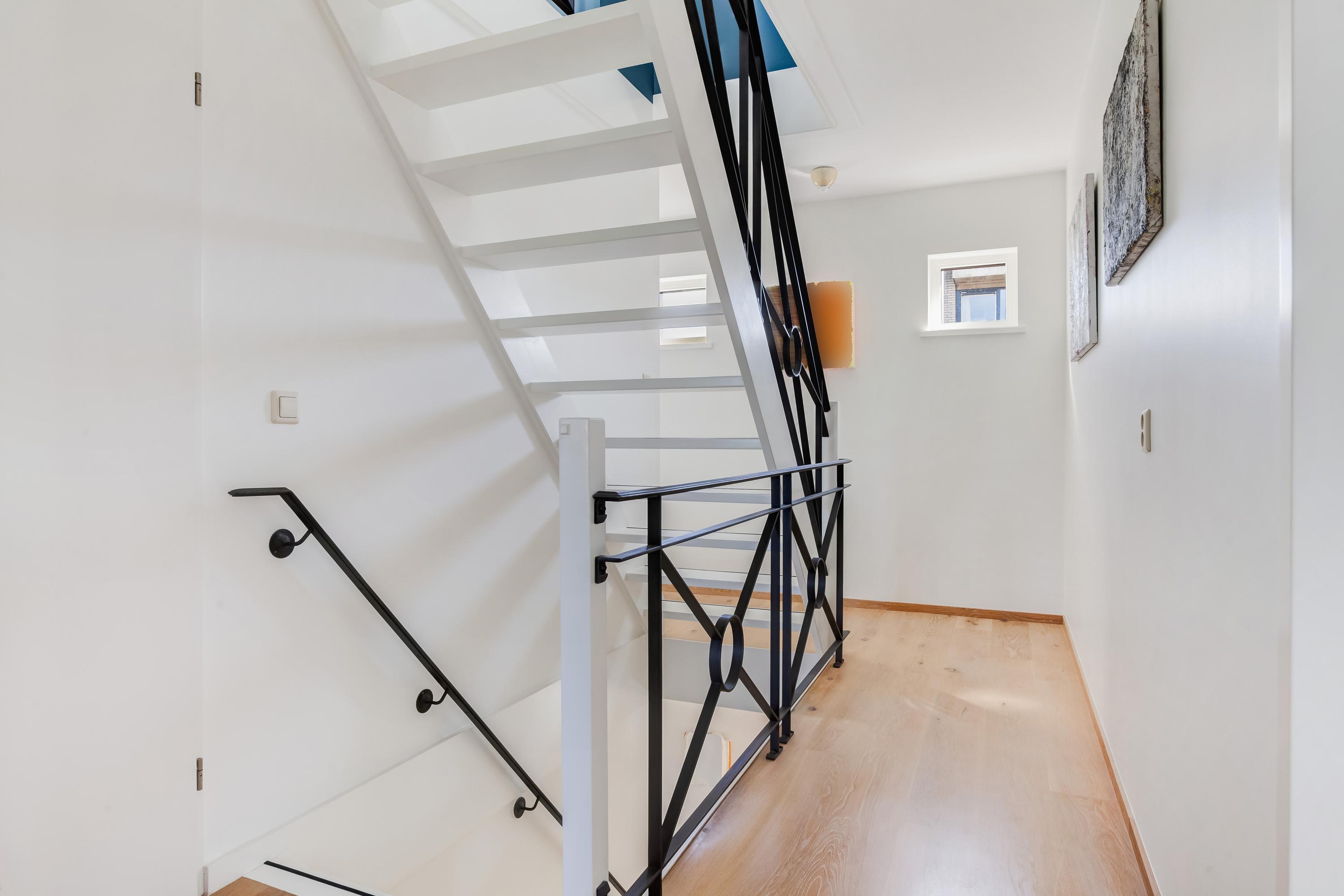 Via de trapopgang bereik je de vierde slaapkamer, een fijne ruimte met een vaste kast waar zich de aansluitingen voor de wasapparatuur bevinden. Vanuit deze kamer heb je via een loopdeur toegang tot het royale en zonnige dakterras, afgewerkt met houten vloerdelen. Een perfecte plek om heerlijk te ontspannen én praktisch voor het drogen van de was.