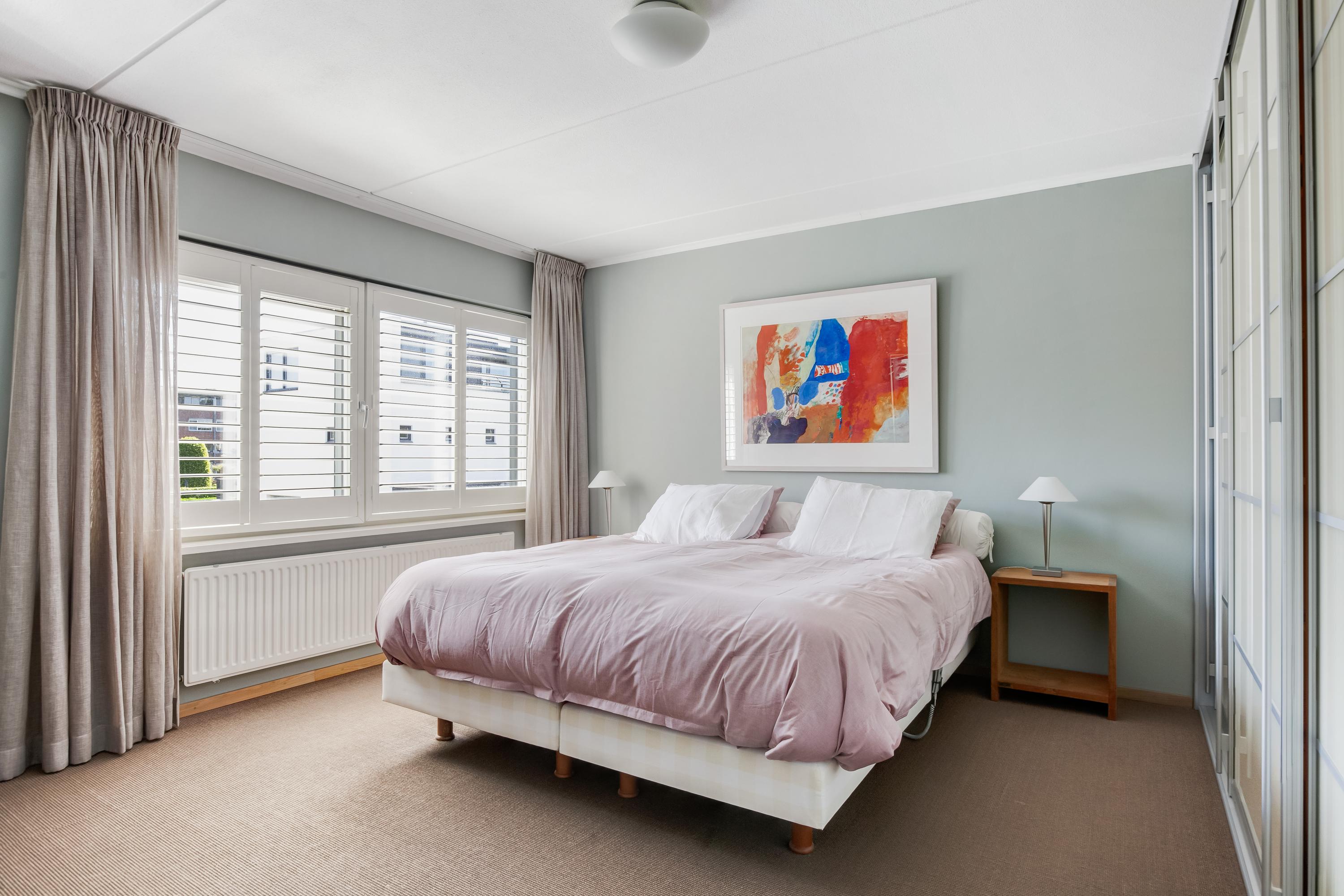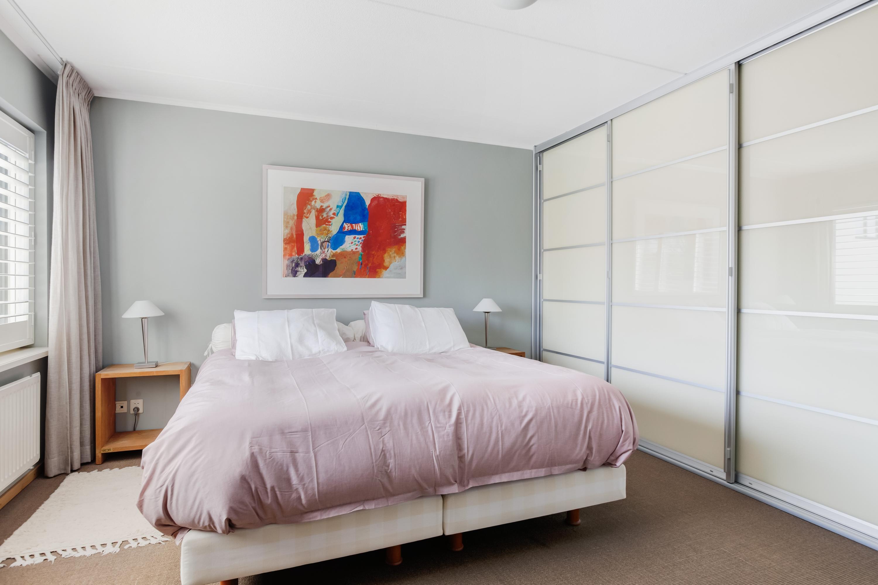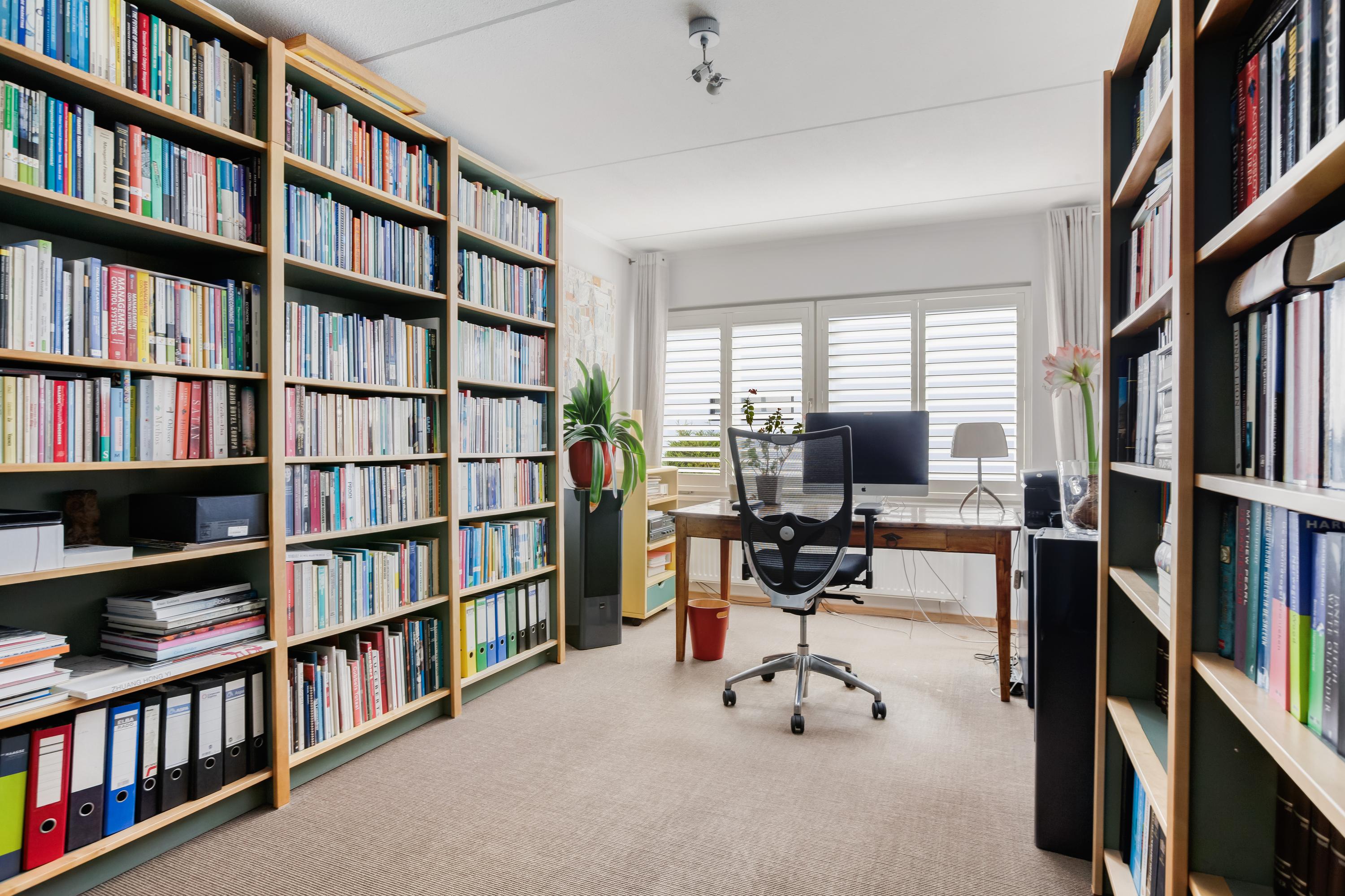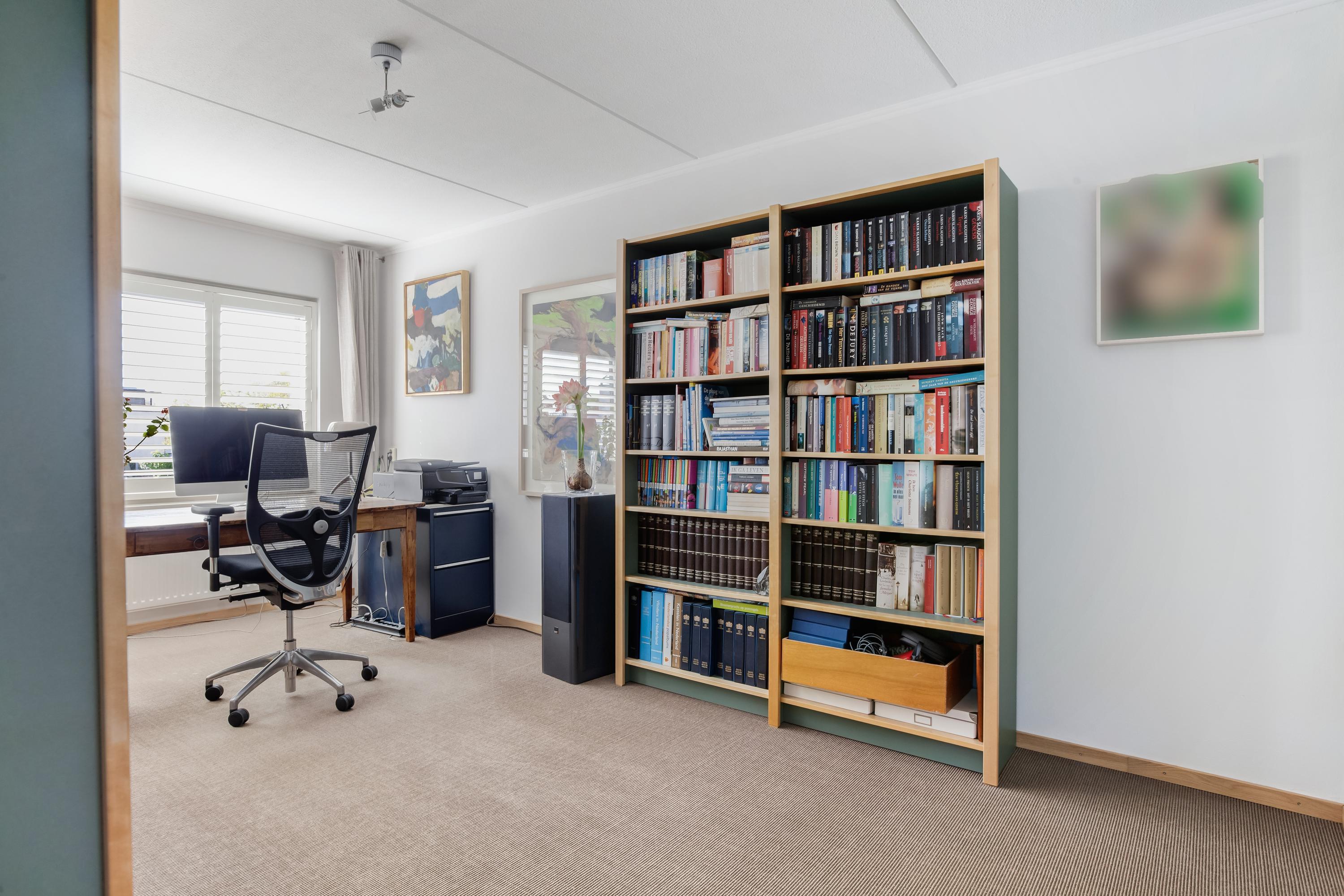 Via de trapopgang bereik je de vierde slaapkamer, een fijne ruimte met een vaste kast waar zich de aansluitingen voor de wasapparatuur bevinden. Vanuit deze kamer heb je via een loopdeur toegang tot het royale en zonnige dakterras, afgewerkt met houten vloerdelen. Een perfecte plek om heerlijk te ontspannen én praktisch voor het drogen van de was.