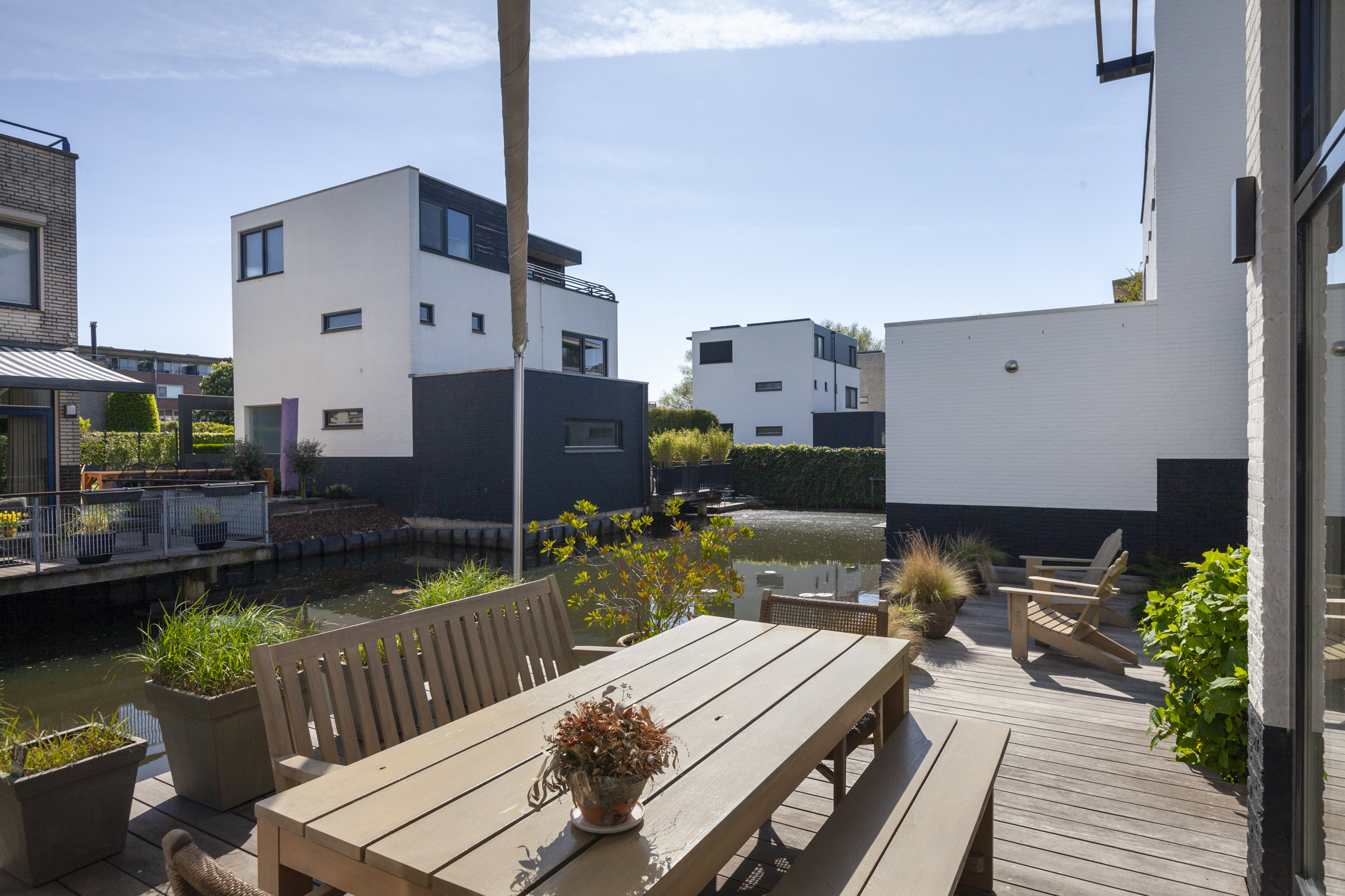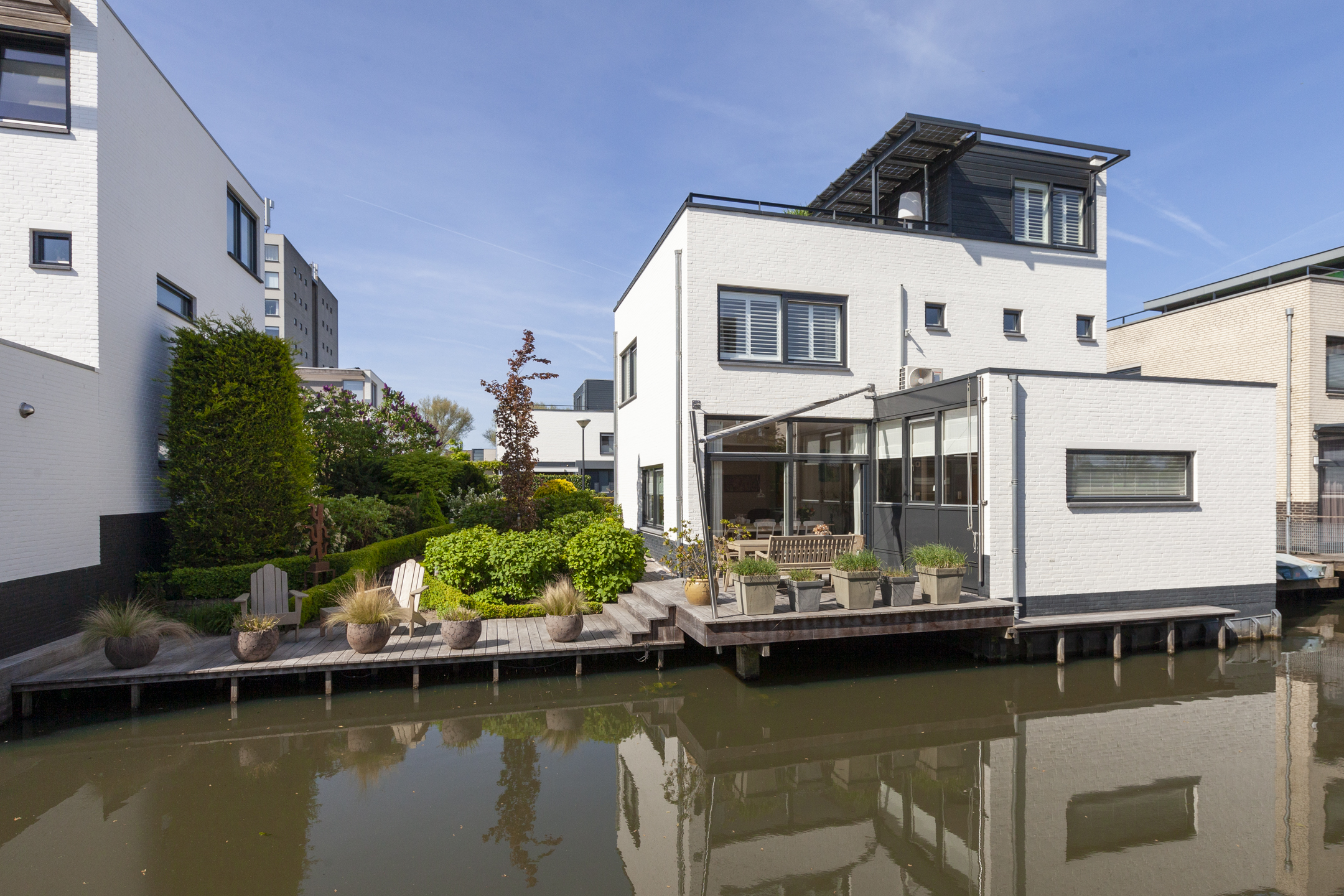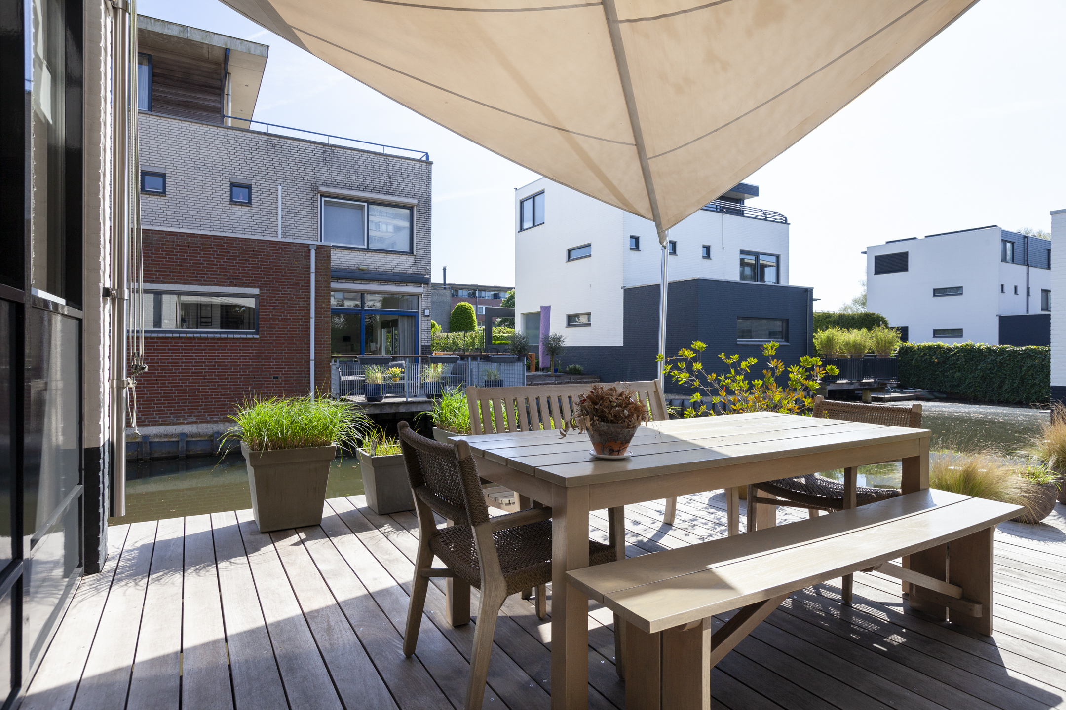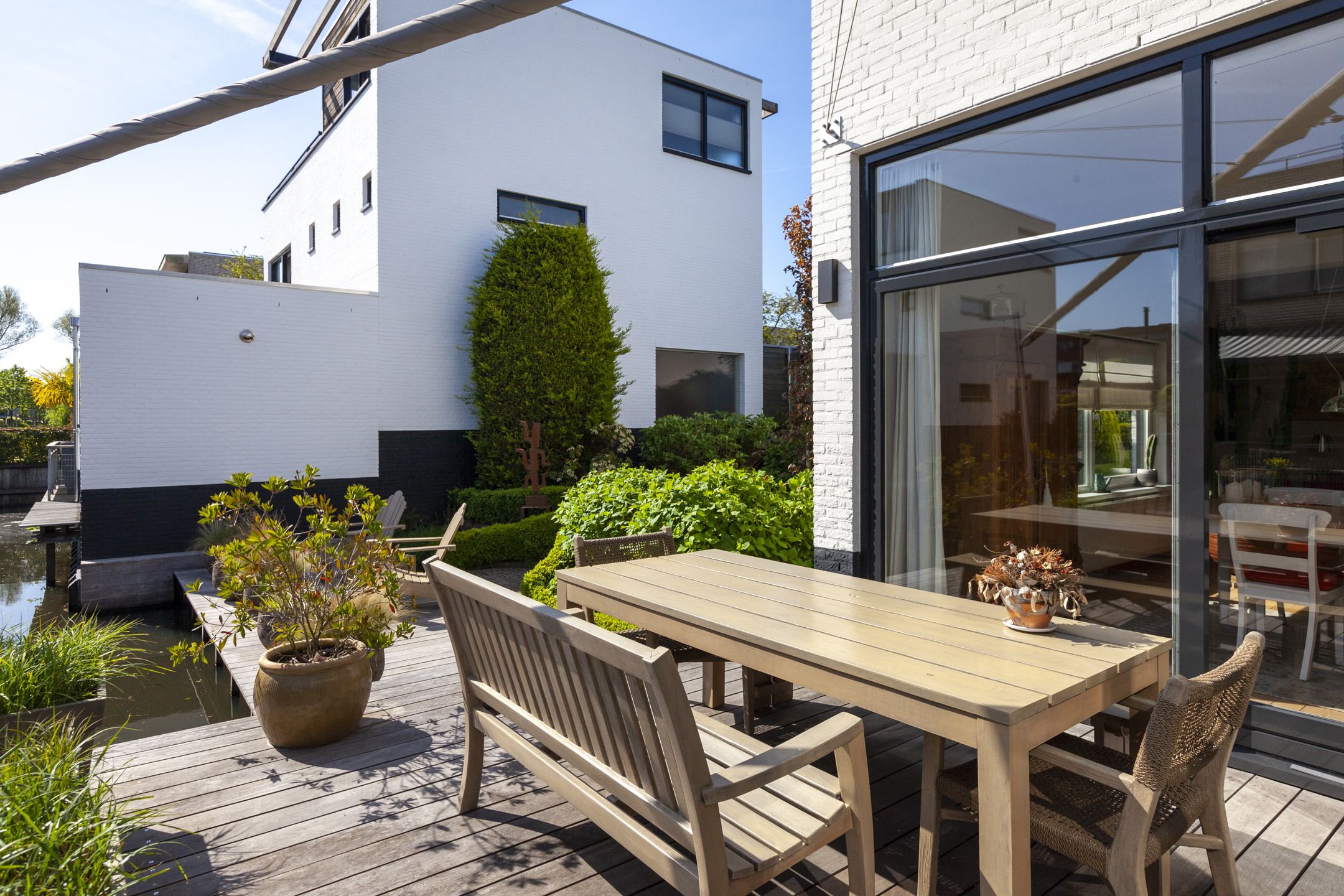 Dankzij de ideale ligging van de verzorgde en speels aangelegde tuin vind je hier op elk moment van de dag wel een fijne plek in de zon of schaduw. Het terras gedeelte is direct aan het water gelegen en biedt de perfecte mogelijkheid om heerlijk buiten te dineren.