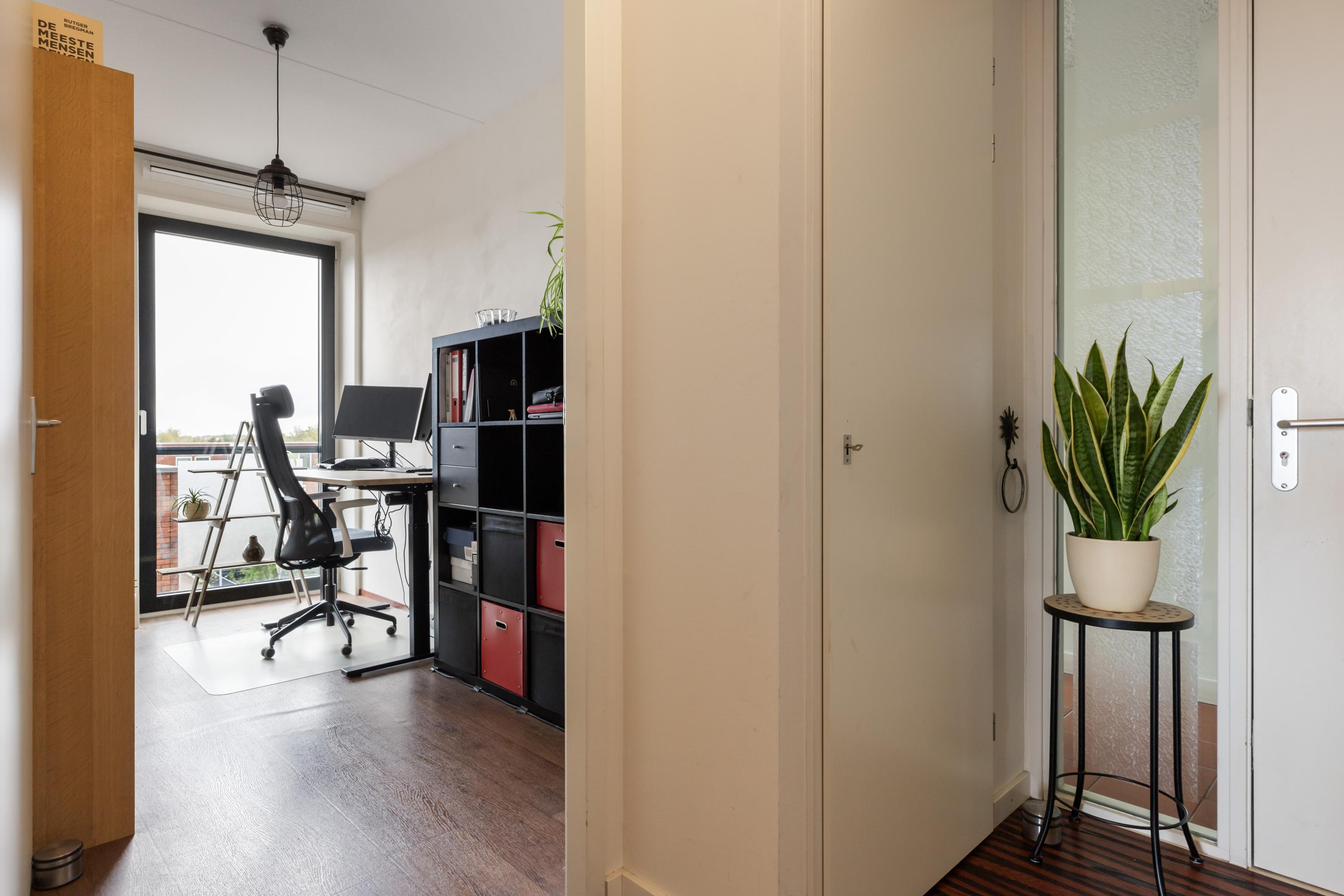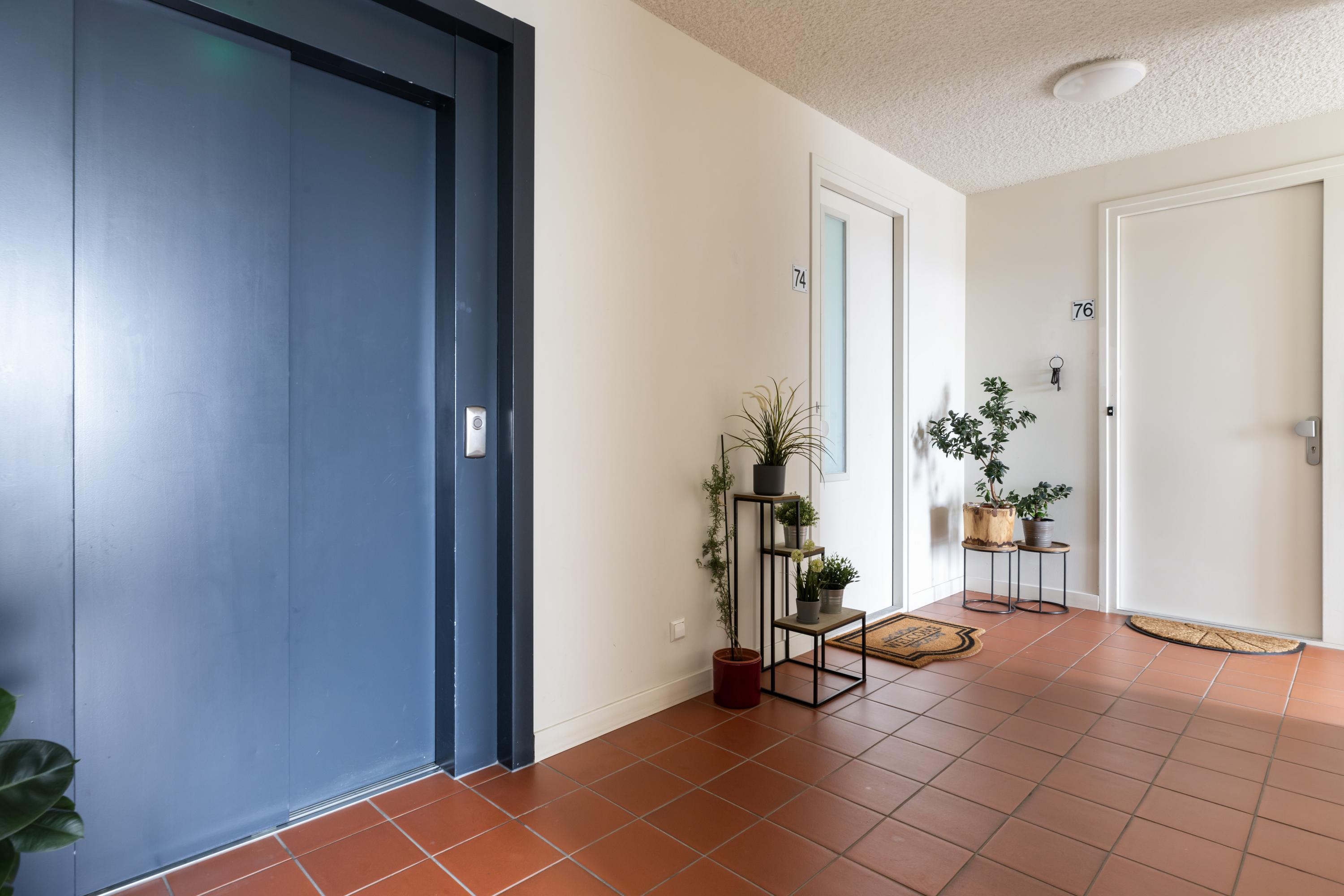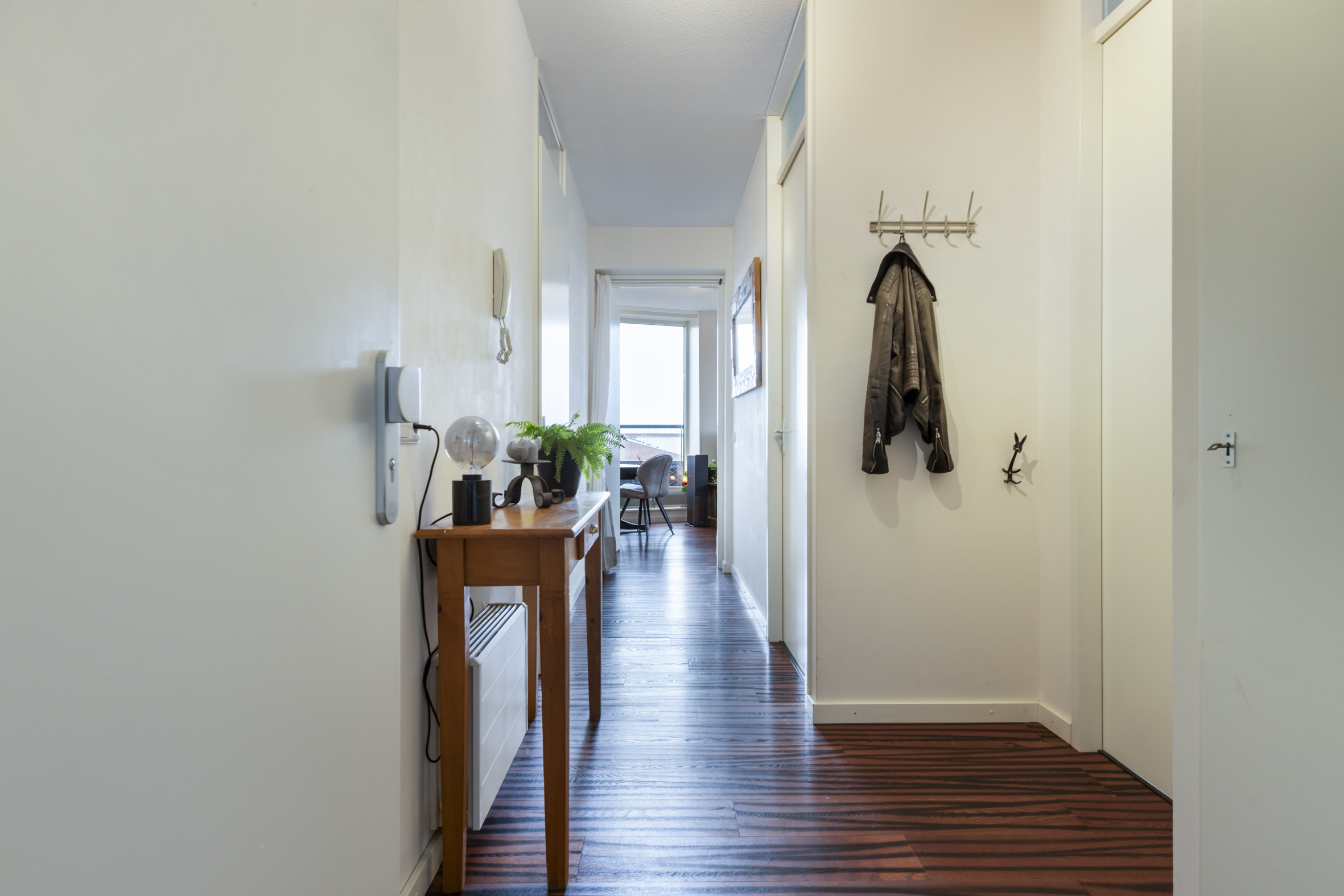 Via de gemeenschappelijke galerij bereik je de voordeur, die toegang biedt tot de hal. In de hal vind je de meterkast en een bergruimte. Hier bevinden zich de aansluitingen voor de wasapparatuur, de mechanische ventilatie box, de installatie voor de blokverwarming en warmwatervoorziening.