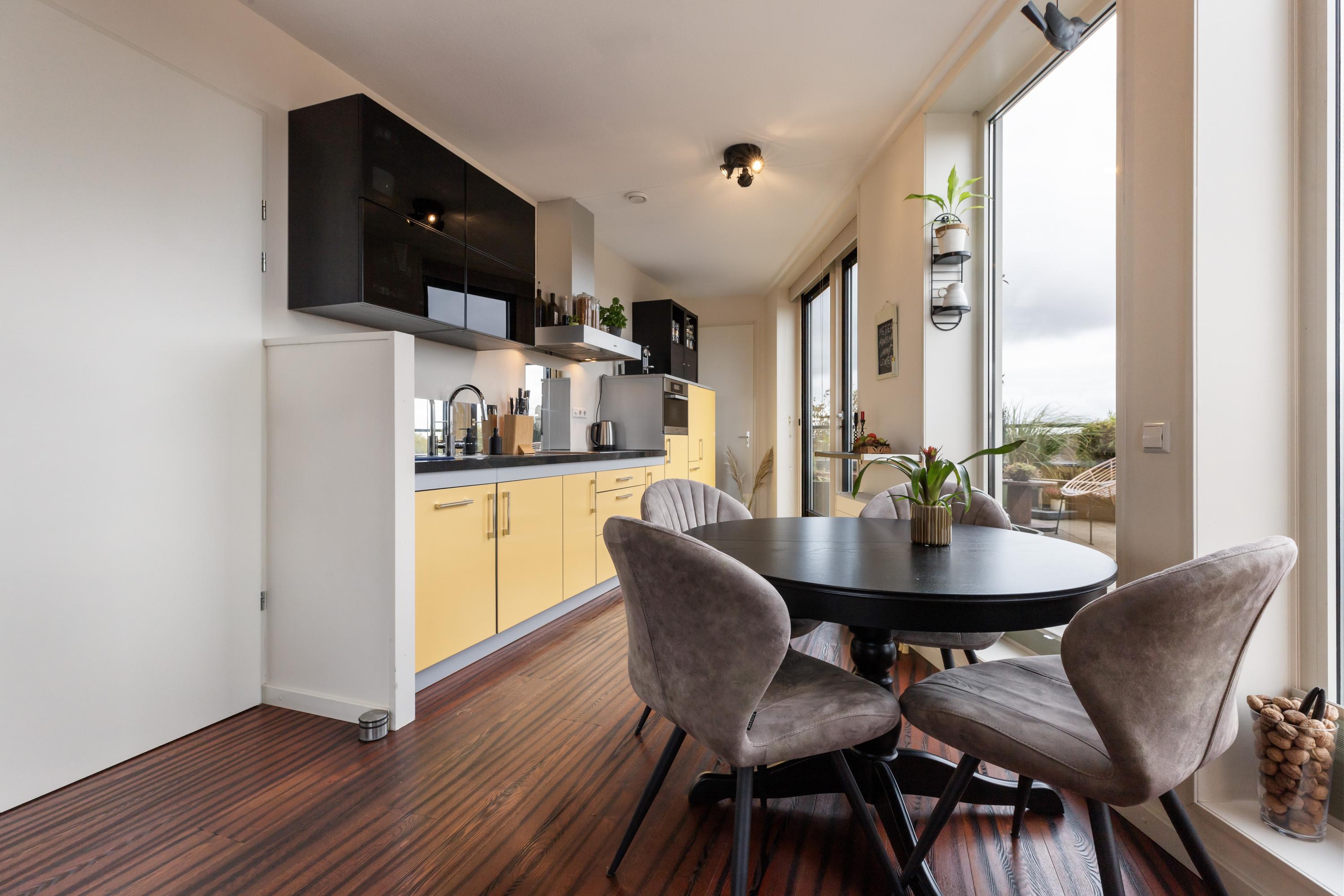 De speels ingedeelde woonkamer met open keuken ontvangt veel daglicht door de grote raampartijen tot aan de vloer. De openslaande deuren in de woonkamer brengen je naar het dakterras. Het dakterras biedt een schitterend uitzicht over de natuurplas en de omgeving. De open keuken is langs één zijde opgesteld en voorzien van: