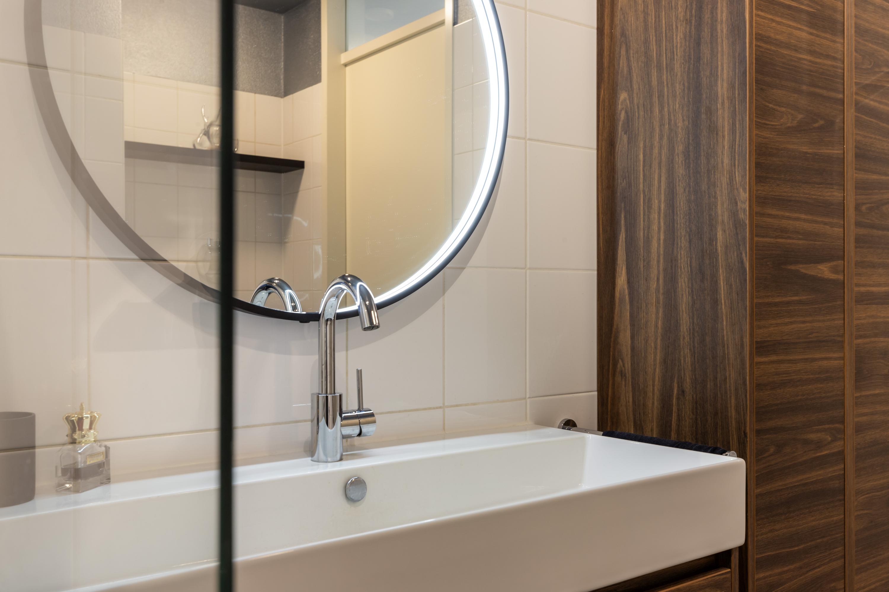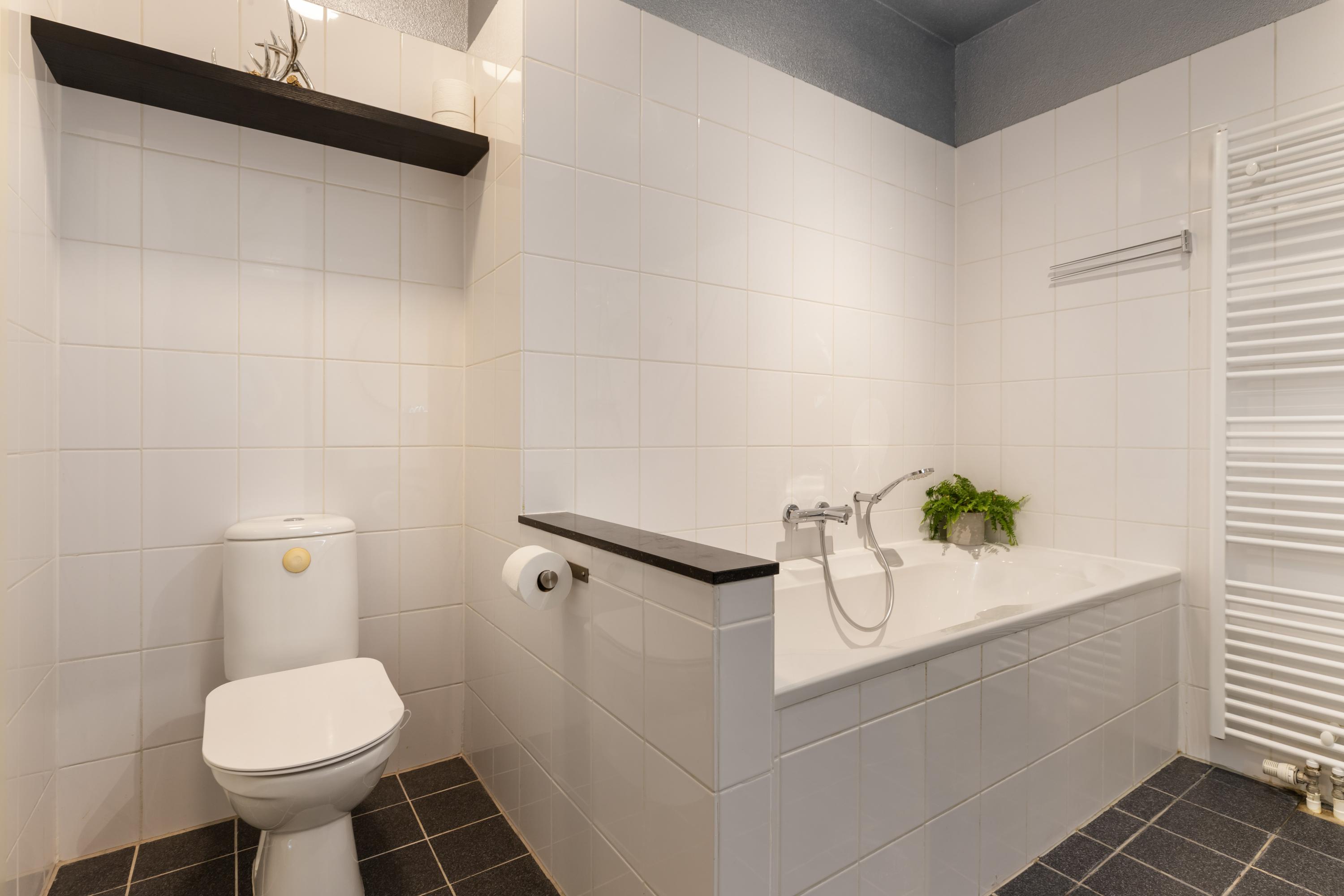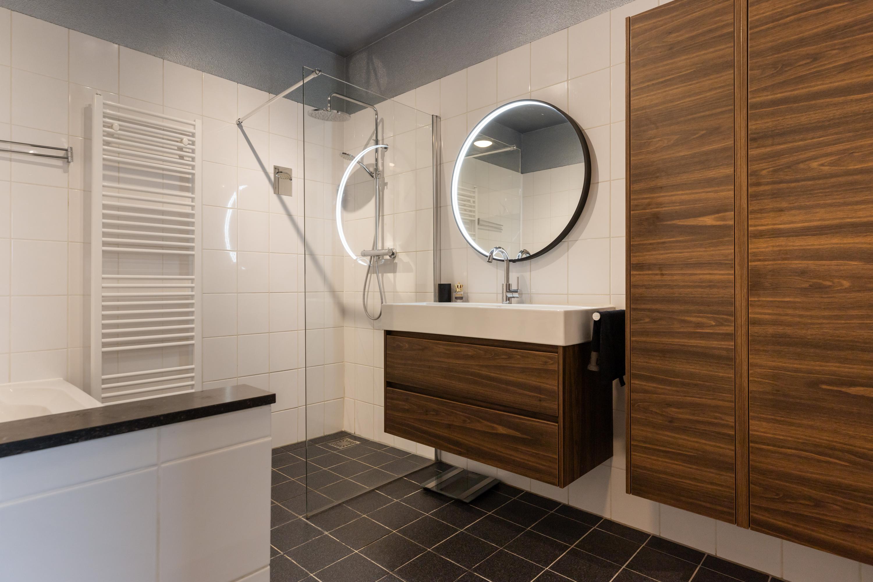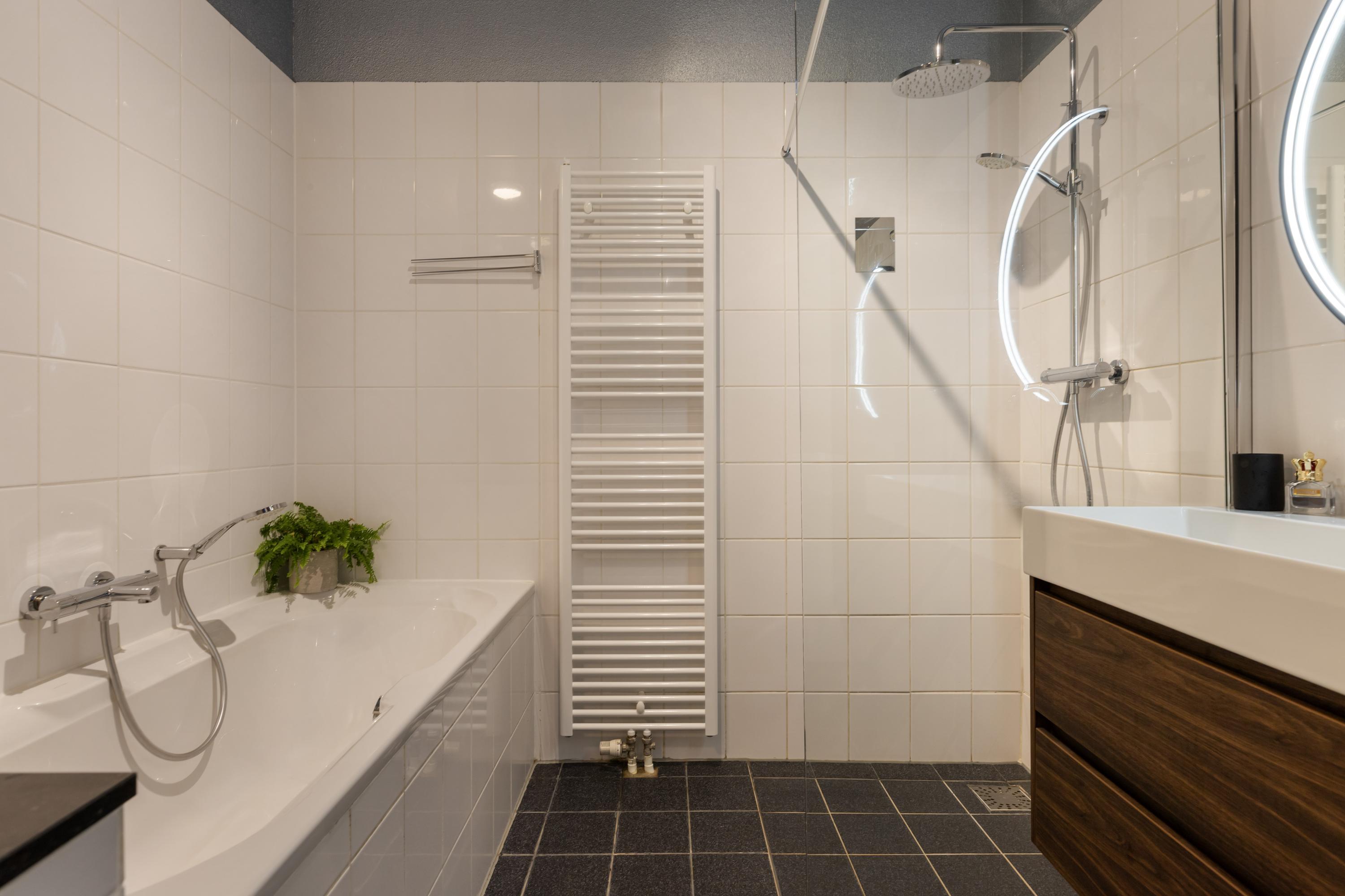 Terug in de hal zijn de badkamer en de slaapkamers te bereiken. De badkamer is volledig betegeld, praktisch ingericht en uitgerust met een ligbad, inloopdouche, toilet, handdoekenradiator en een wastafelmeubel met bijbehorende kast.
