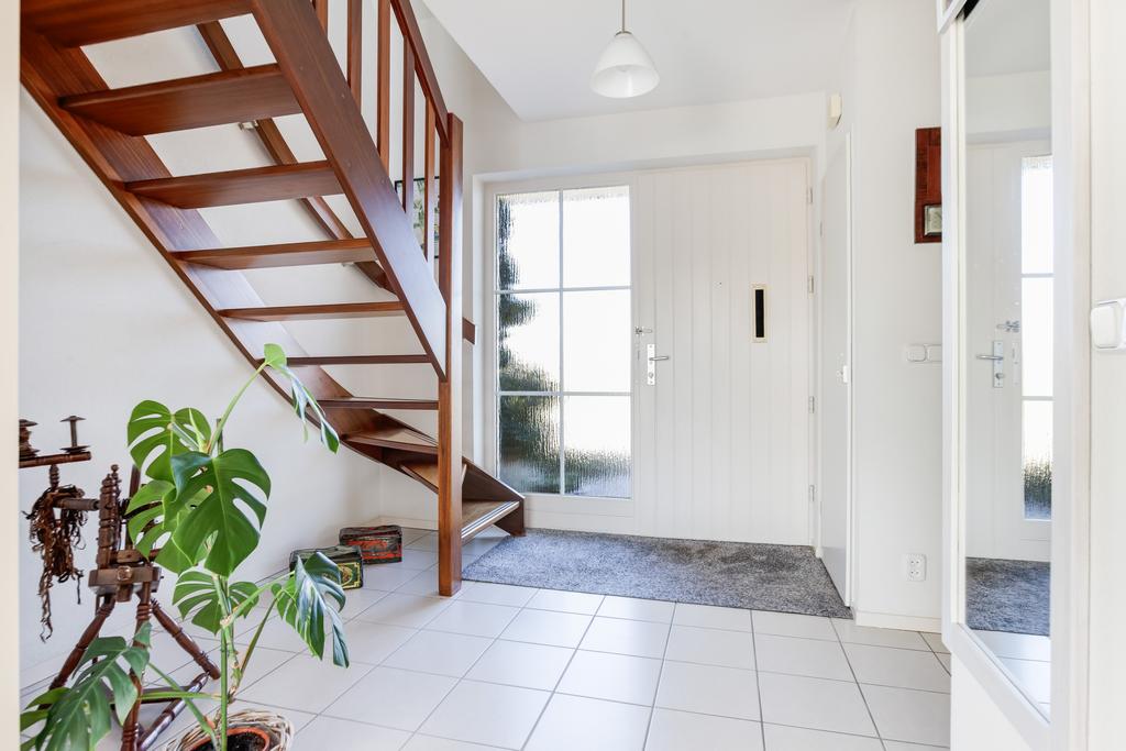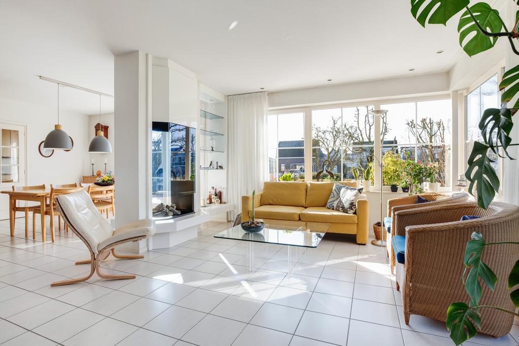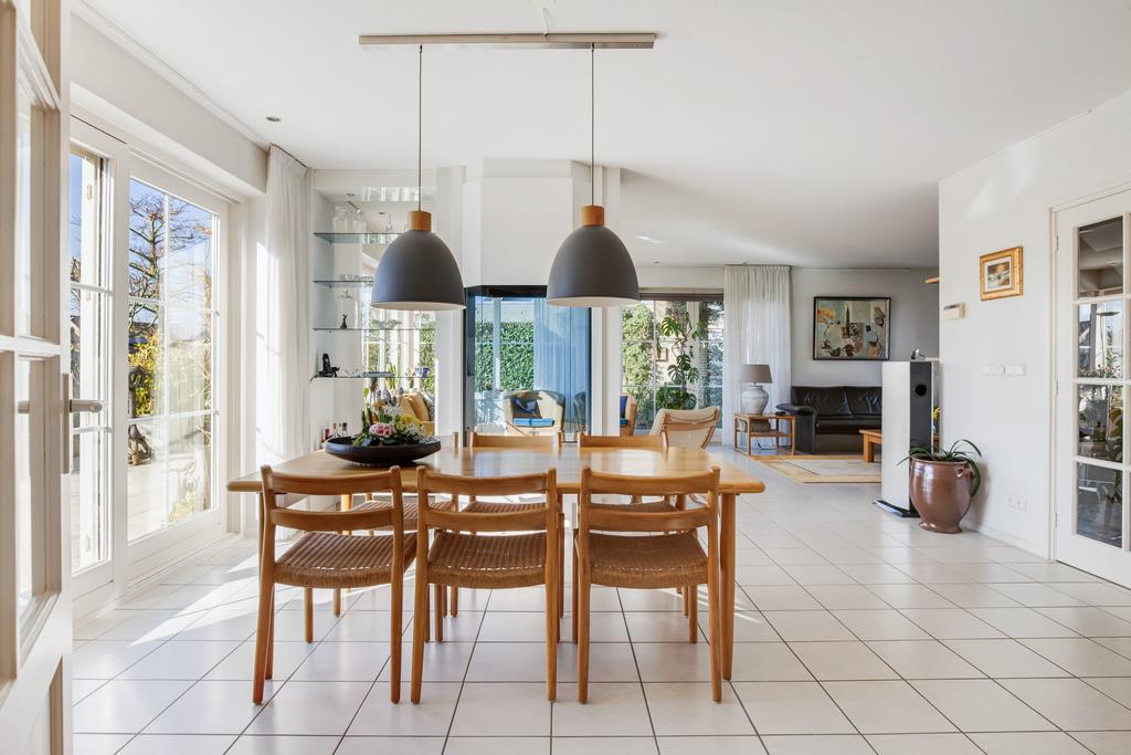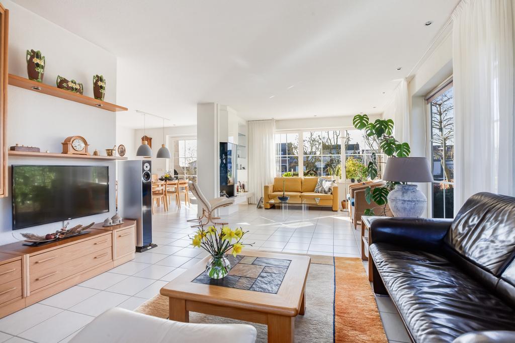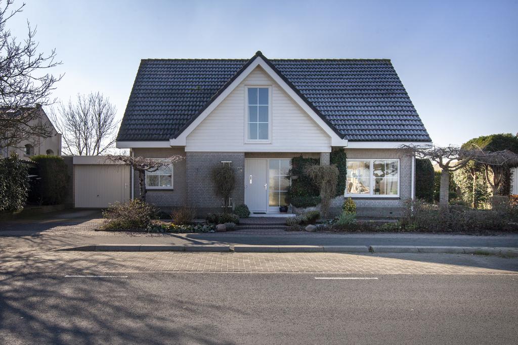 Voor de garage en naast de woning aan de rechterzijde is er ruimte om de auto's te parkeren en middels de verzorgde voortuin bereik je overdekte voordeur. In de hal is er een hardhouten trap naar de verdieping, de toiletruimte met wandcloset en fonteintje, de deur naar de werkkamer en de meterkast. Via de glazen dubbele deuren stap je binnen in de royale living van maar liefst 50 m2. Hier vind je een sfeervolle gashaard en grote raampartijen, waardoor het lekker licht is. De schuifdeur in de achtergevel en de openslaande deuren in de zijgevel brengen je naar de tuin.