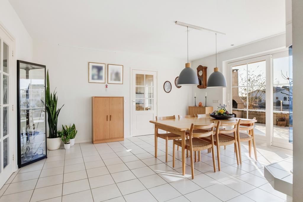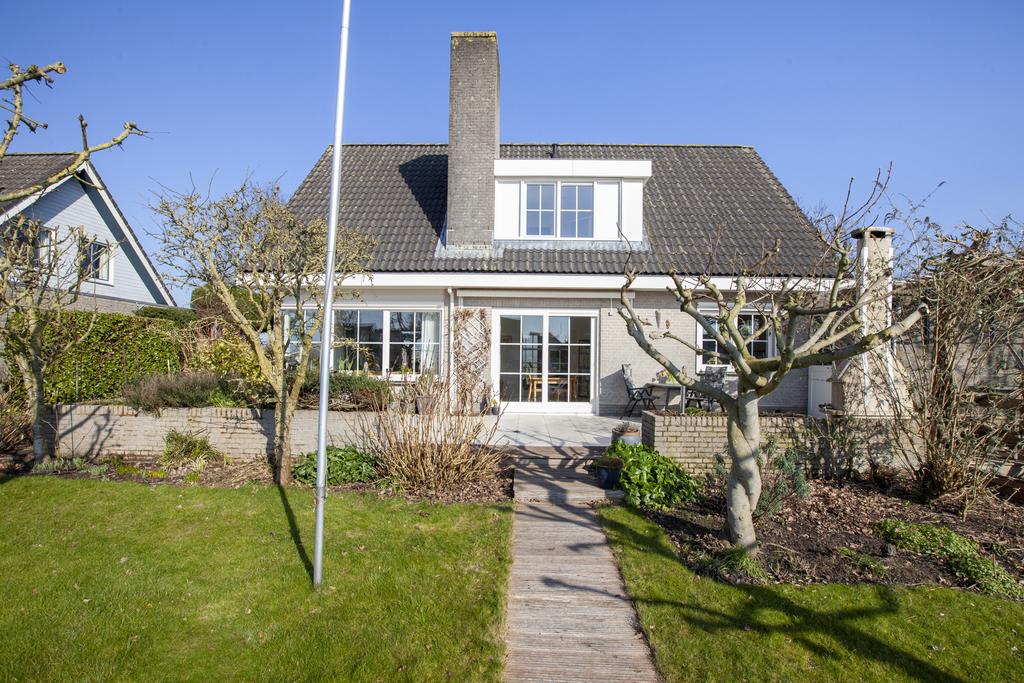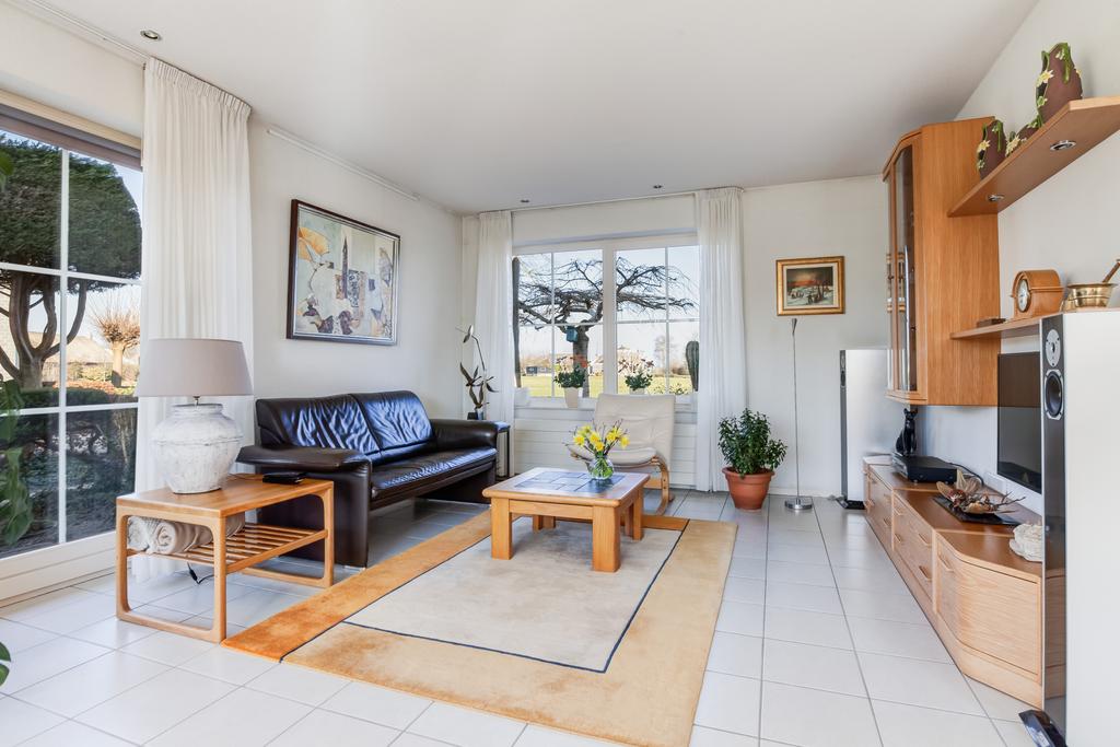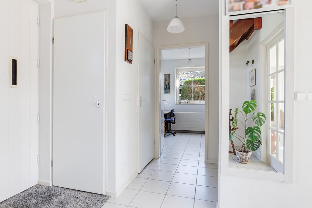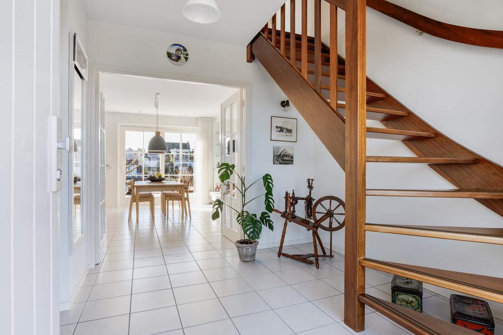 Voor de garage en naast de woning aan de rechterzijde is er ruimte om de auto's te parkeren en middels de verzorgde voortuin bereik je overdekte voordeur. In de hal is er een hardhouten trap naar de verdieping, de toiletruimte met wandcloset en fonteintje, de deur naar de werkkamer en de meterkast. Via de glazen dubbele deuren stap je binnen in de royale living van maar liefst 50 m2. Hier vind je een sfeervolle gashaard en grote raampartijen, waardoor het lekker licht is. De schuifdeur in de achtergevel en de openslaande deuren in de zijgevel brengen je naar de tuin.