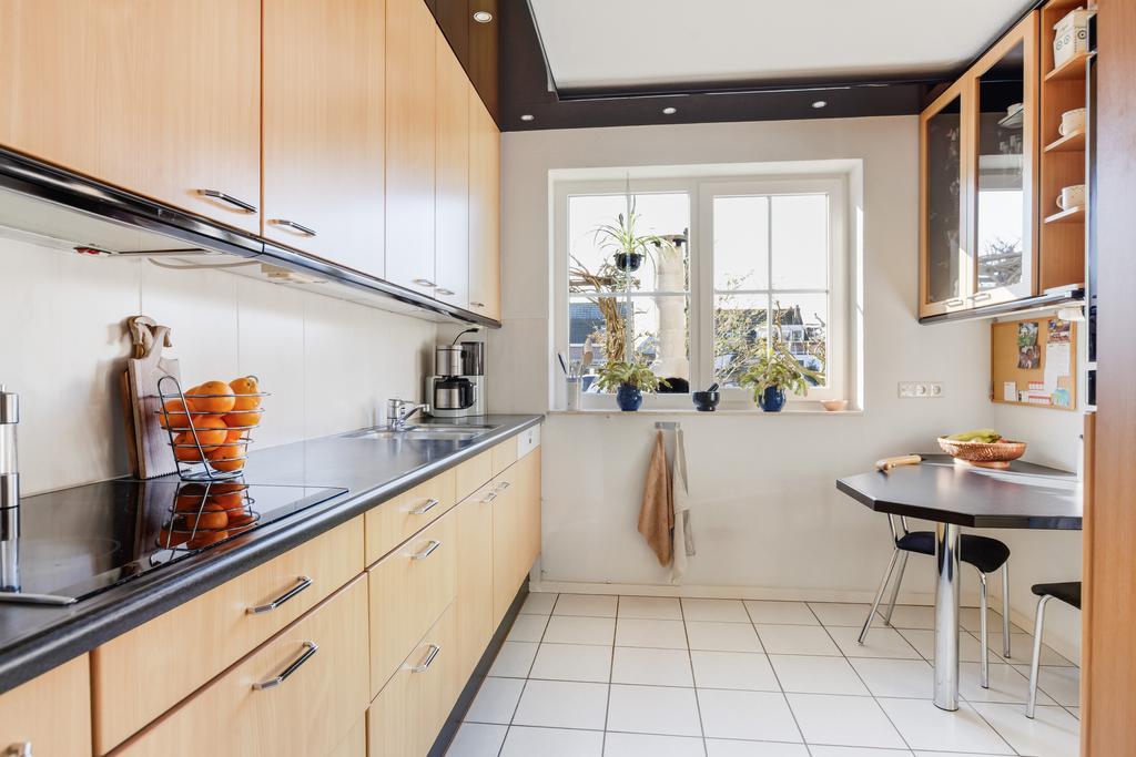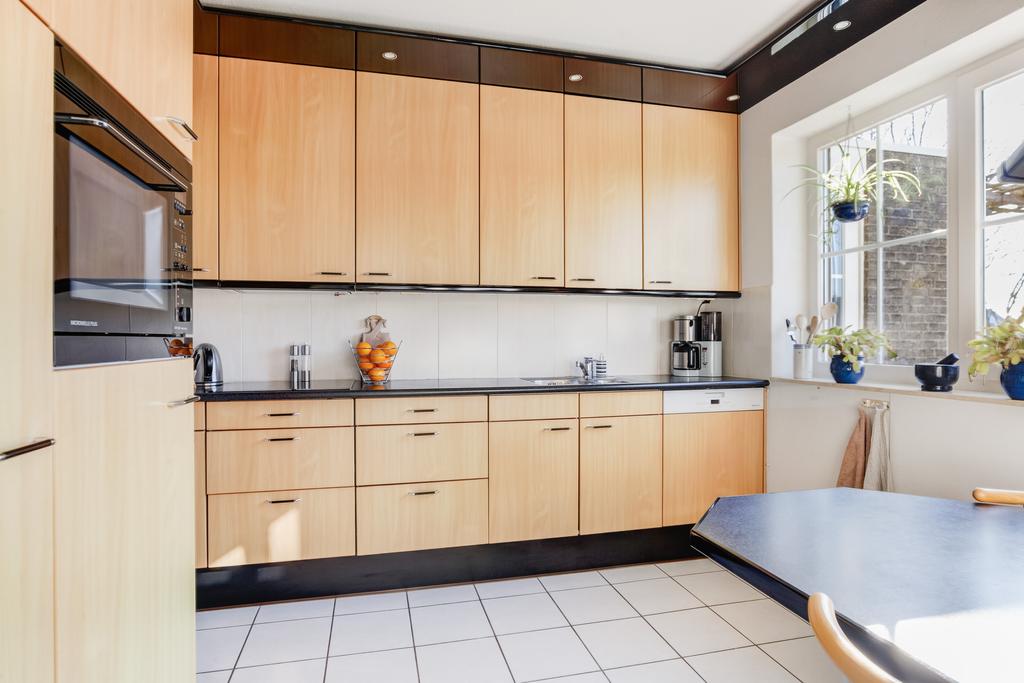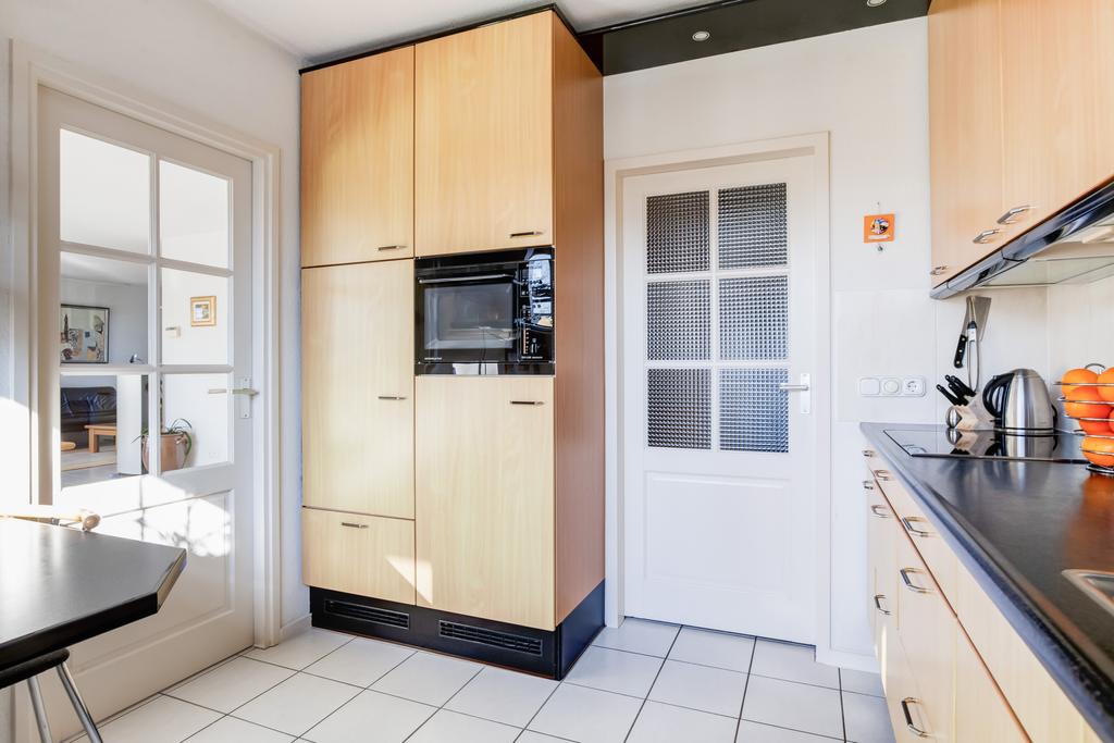 Aan de achterzijde ligt de gesloten keukenruimte met uitzicht over de achtertuin. De volgende inbouwapparatuur is aanwezig: